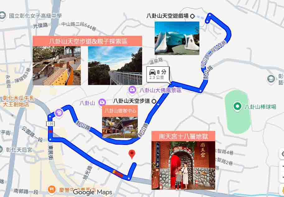 八卦山天空步道共有7個入口,總長約1006公尺,為全台最長的天空步道。距離地面約三層樓高的景觀步道。想帶孩子放電導航位置看清楚。