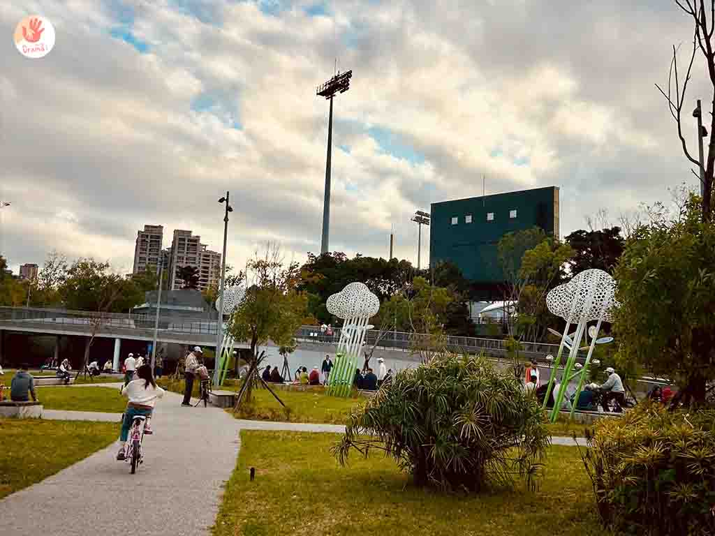 [新莊棒球主題共融式公園]腹地真的超大,有3場域的共融設施,還有超大的草皮區非常適合野餐~~也可以帶上腳踏車和滑步車來追風