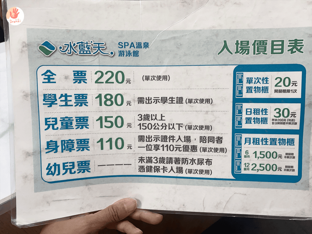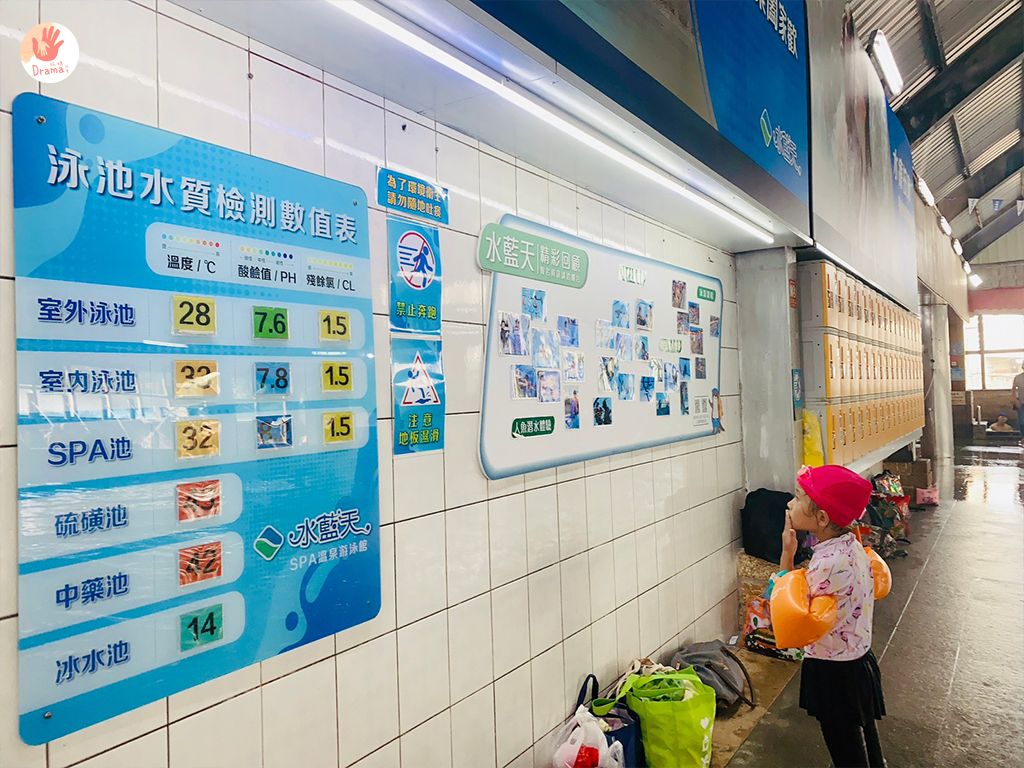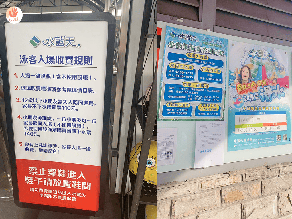 在門口會寫每日設施開放的時間場次,每天會不一樣,他們會依人加調整,入場前可以先看想玩的設施是否有開放,以免玩得不開心喲~這裡蠻好的有售不下水的陪同票,會給你一張貼紙要貼身上