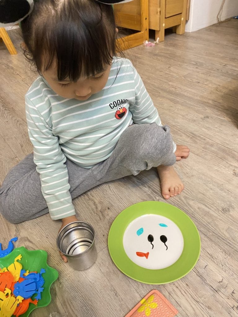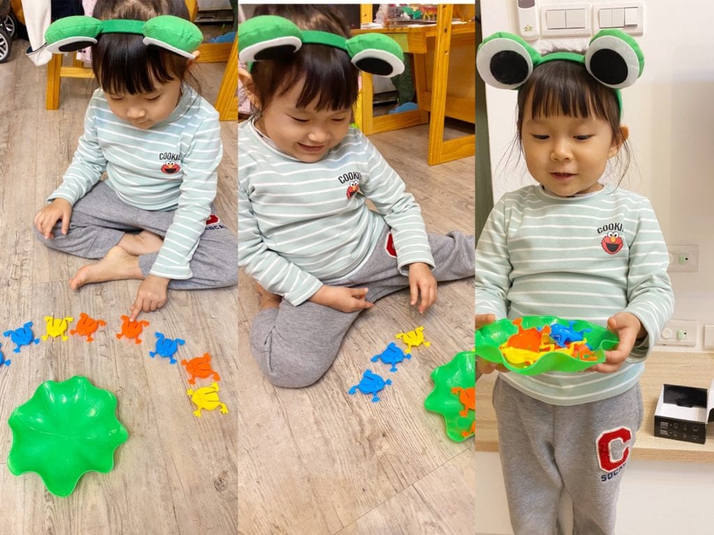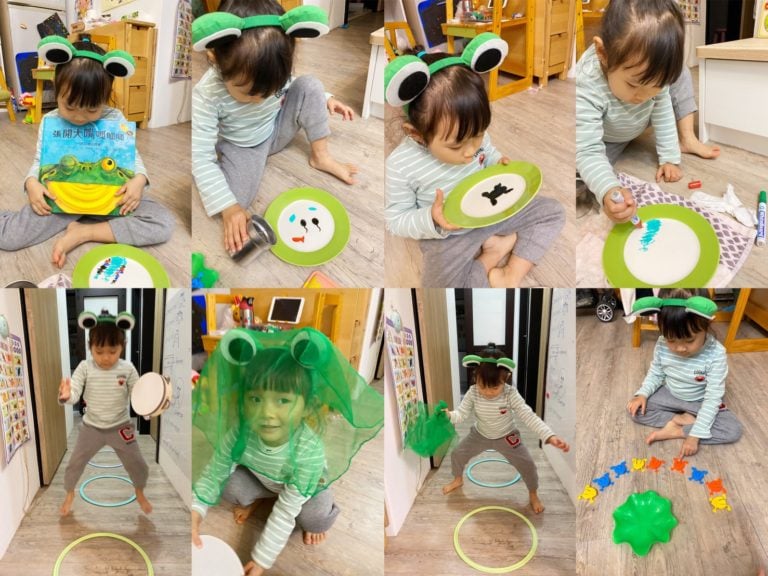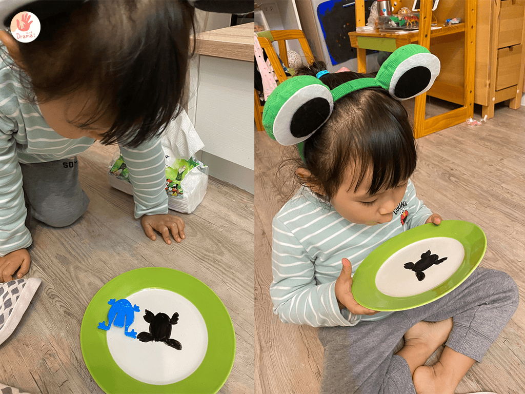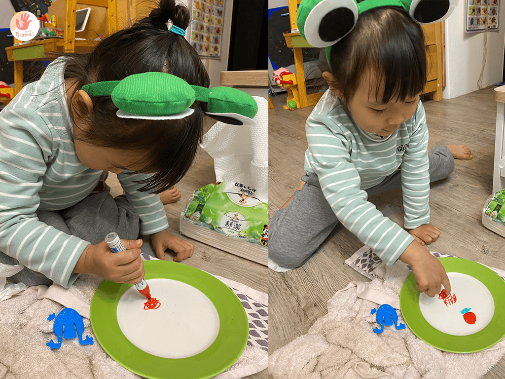 讀完這本書時,抓媽會跟寶貝說青蛙的小時候是一隻小蝌蚪,蝌蚪的嘴很小所以都吃水裡的小魚和水草葉葉,接著抓媽就在盤子上,用不同顏色的白板筆畫出蝌蚪/葉子/魚,光是這個小實驗玩法,寶貝就玩了半小時以上,不斷挑戰實在太好玩了!