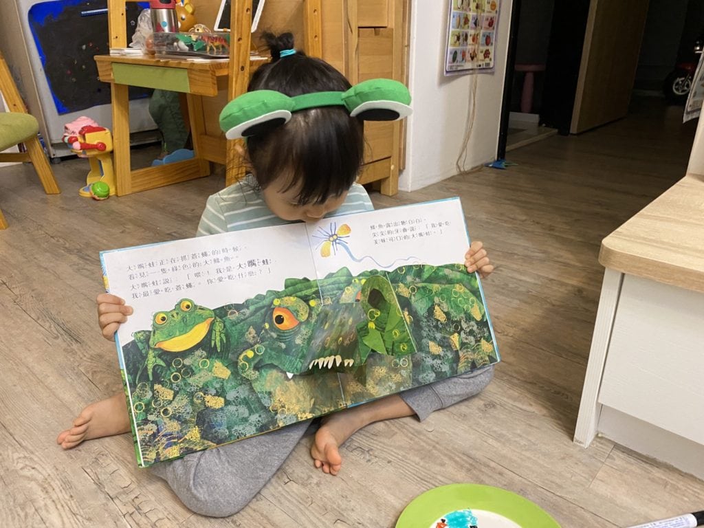 張開大嘴呱呱呱是一本非常具有視覺效果又有趣可愛的立體書,非常推薦入手!故事裡的大嘴呱呱呱愛吃蒼蠅,展開他的冒險之旅,他到處問別人愛吃什麼,最後遇到愛上大嘴蛙的鱷魚,大嘴蛙也很機智的變成小嘴蛙逃走,故事畫面都超活潑有趣,一起來看看抓媽和寶貝在二歲時的親子共讀。