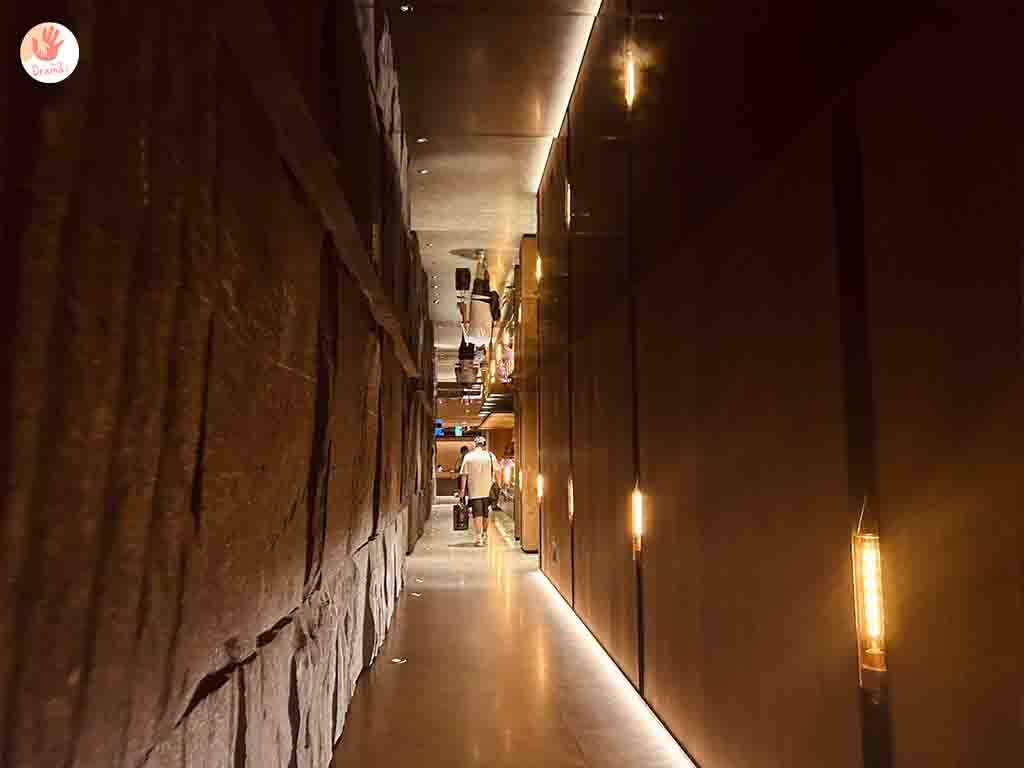 [中華航空貴賓室]通過長廊走到底就是商務休息區,這個廊道的風格設計還以為是來到燒烤店,整個氣氛很適合來微醺一杯