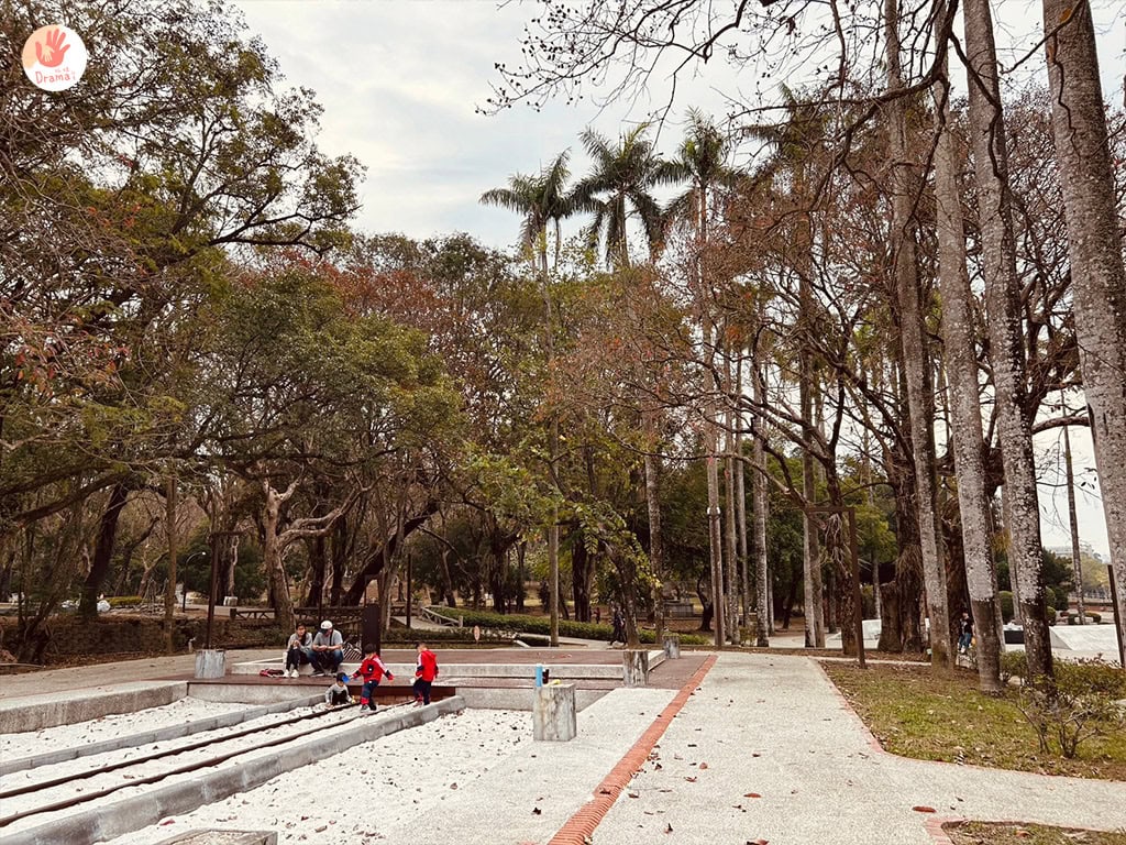 [嘉義公園]真的很大,要從[飛碟溜滑梯]走到[樹屋尋寶遊戲場]大約要走8~10分鐘,當走到看到孔廟就表示要到了