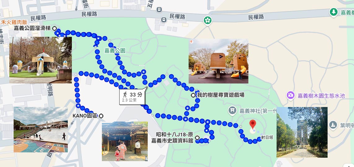 但[樹屋尋寶遊戲場]位在公園裡,用Google map [我的樹屋尋寶遊戲場](導航點這裡),去完[樹屋尋寶遊戲場],依下圖也可以再去[射日塔和昭和J18]和[KANO園區]吃冰喝個下午茶也很不錯喲。