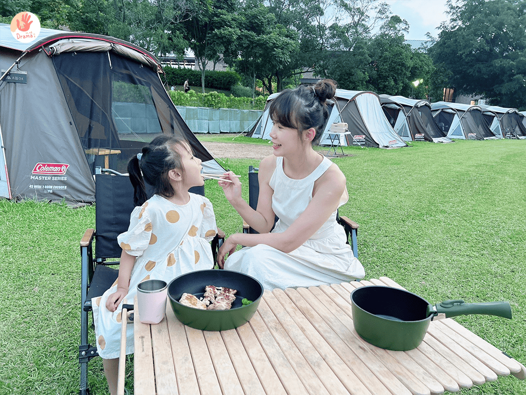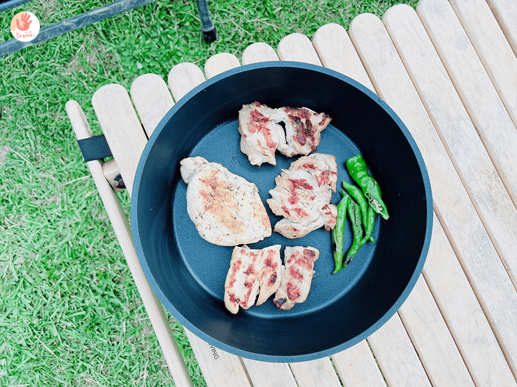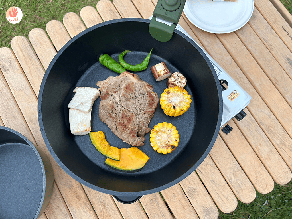 煎完直接卸下把手,當作是餐盤直接上桌,小孩在草地奔玩不怕吃到冷食,還有煎鍋的溫度,微溫入口剛剛剛好