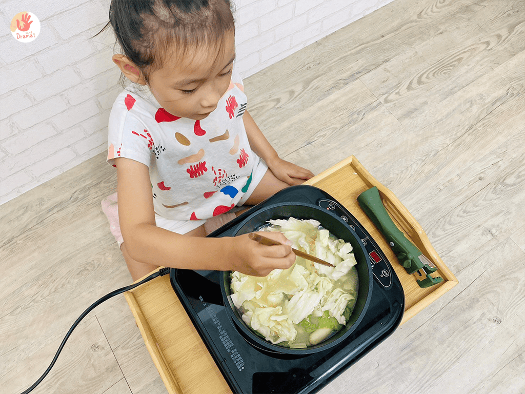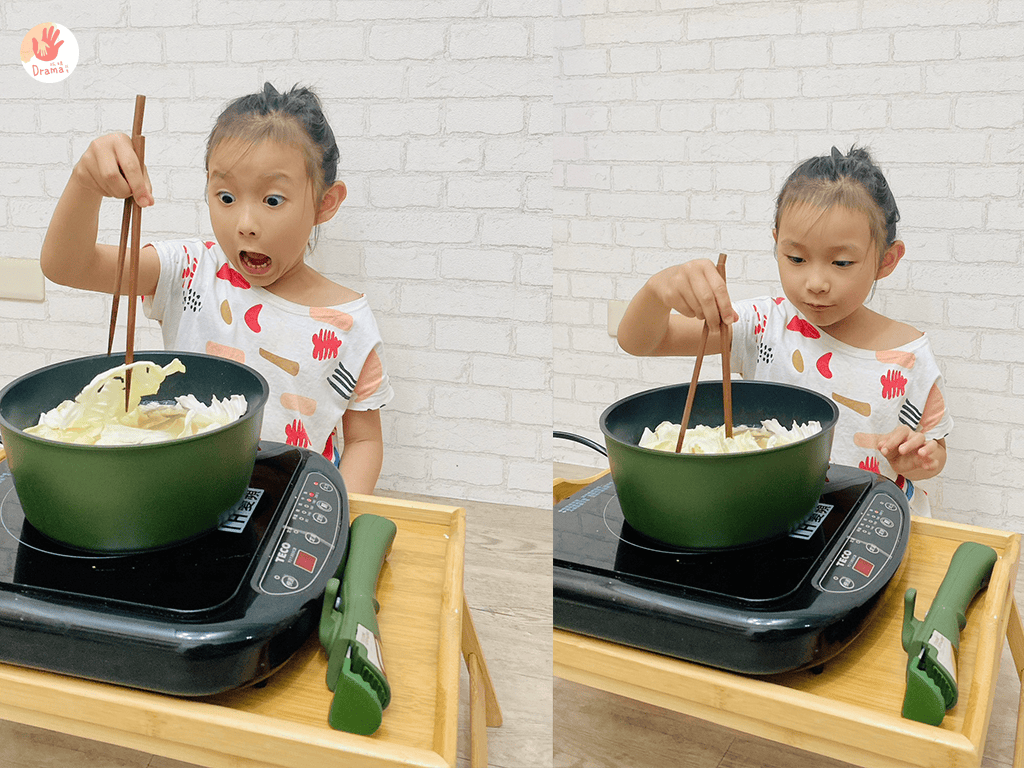 然後女鵝就變料理小廚師了,請她幫忙,她倒是玩得很開心,果然長大就可以稍微放手讓她試看看