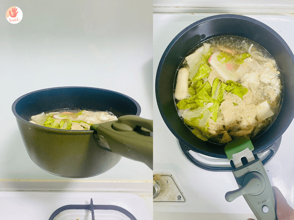 可拆式把手的好處就是平煎鍋完成後,可以拆掉握把直接上桌還有鍋子的熱度可以保溫,不用喬桌子的空間,湯鍋也一樣輕鬆移動上桌不佔空間