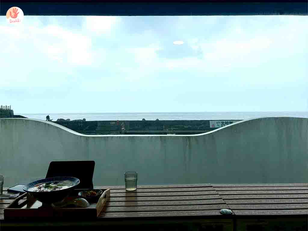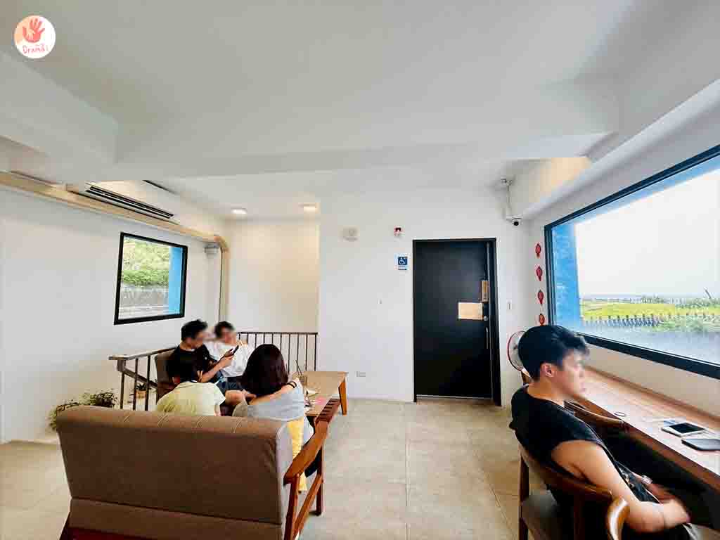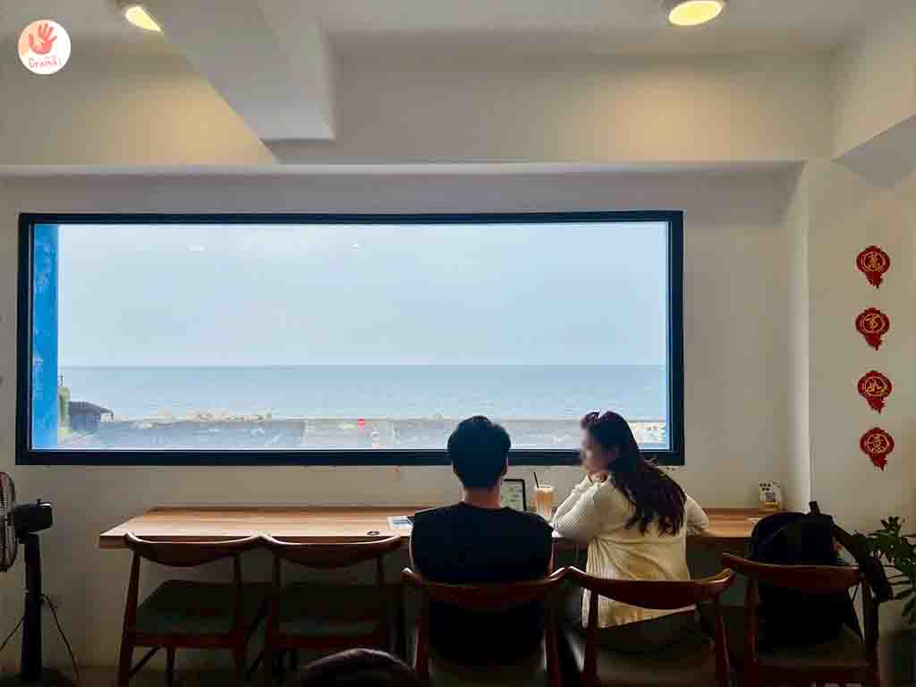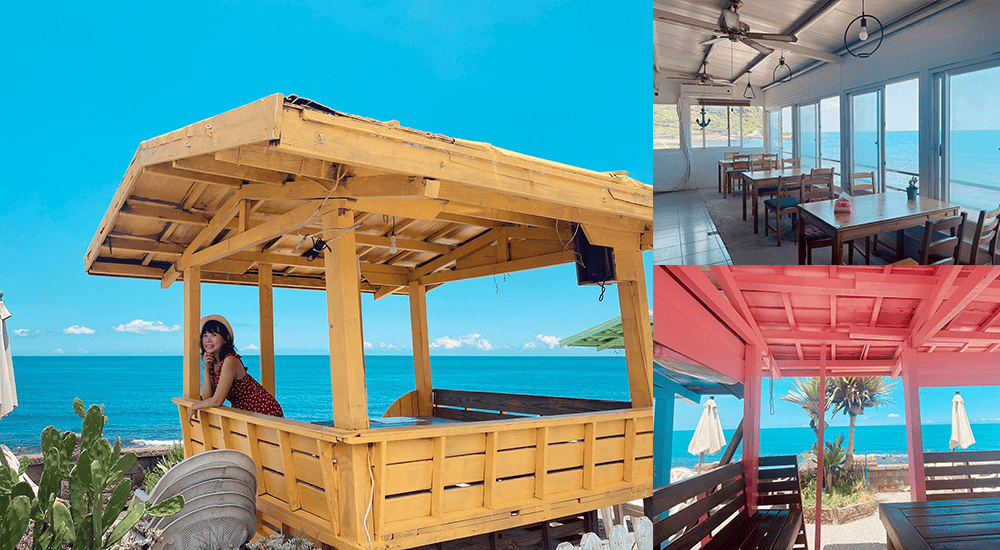 [金點草里驛棧]的座位有室內和戶外,靠窗的位置有長方格窗,藍天海線就像是一幅天然畫掛在店內