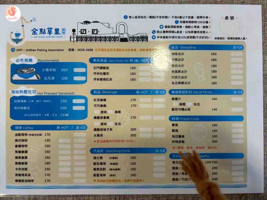 [金點草里驛棧]由新北市金山區漁會管理,打造漁港海天窗景的漁港咖啡館,超級推薦鮮美好吃的小卷米粉,喜歡釣魚的也可以在[金點草里驛棧]租借租釣具、送魚餌,再免費借用救生衣及椅子,可以放鬆一午後。
