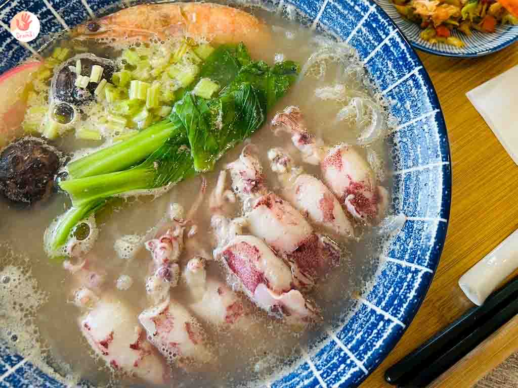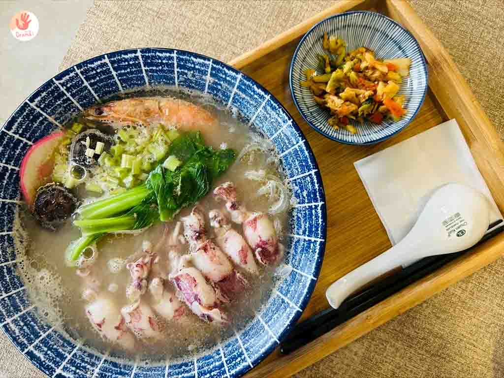 [金點草里驛棧]的湯好鮮甜可口~重點小卷超鮮嫩好吃,小菜是辣菜,是夠味夠辣的,加入麵裡愛吃辣肯定會超愛,話說這米粉和一般麵店的米粉不一樣,是粗米粉