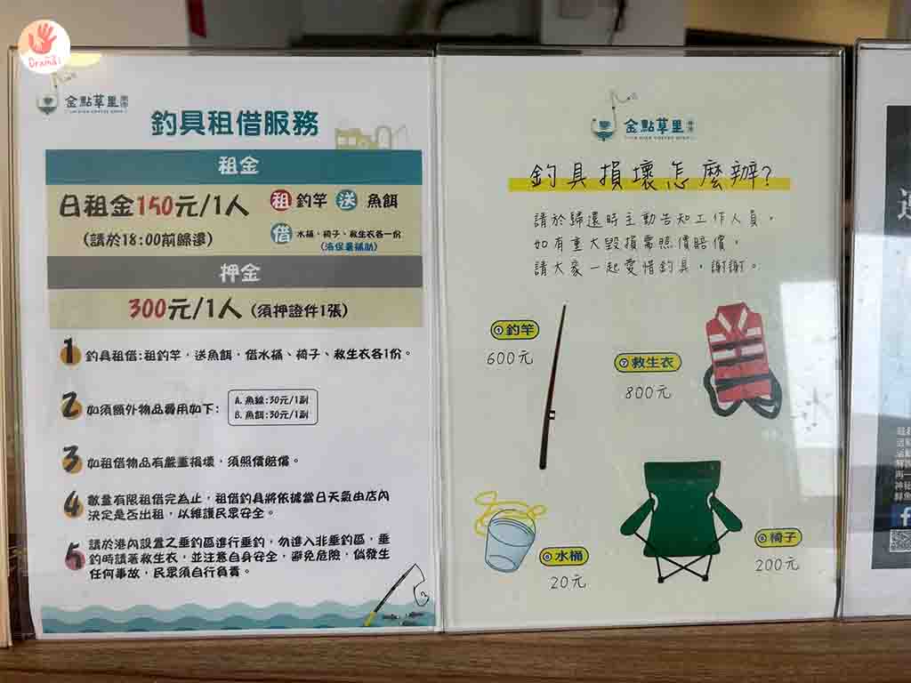 [金點草里驛棧]日租釣竿還有送魚餌,午後也可以直接走下階梯就在漁港開釣,蠻悠閒的觀海吃海味的好去處