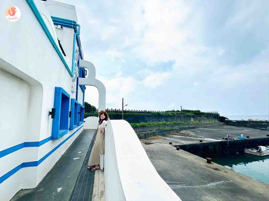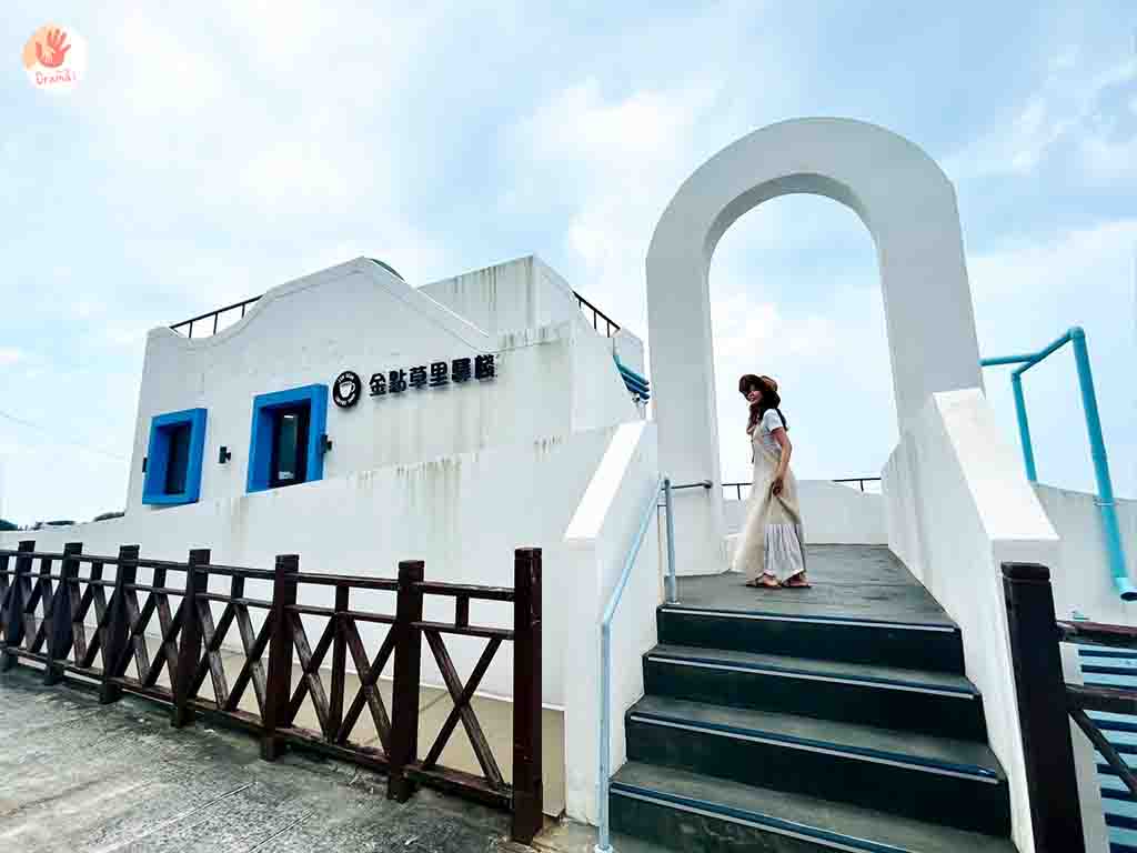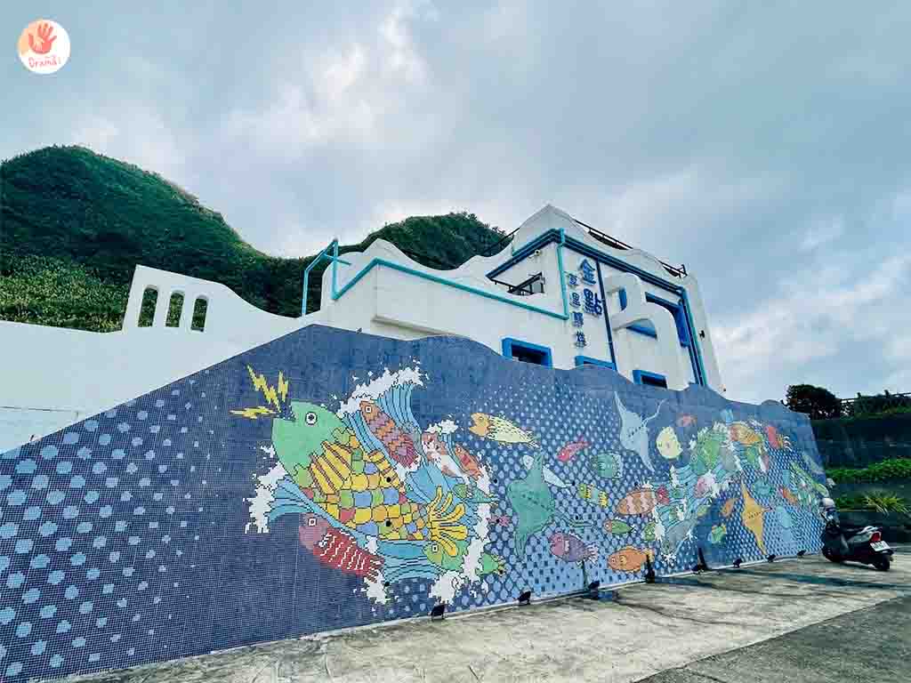 [金點草里驛棧]藍白建物,階梯下的牆面是馬賽克牆造景,很好拍