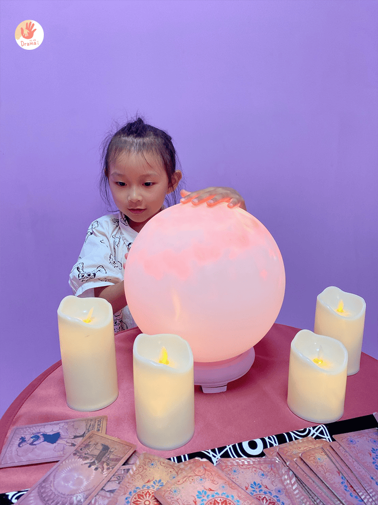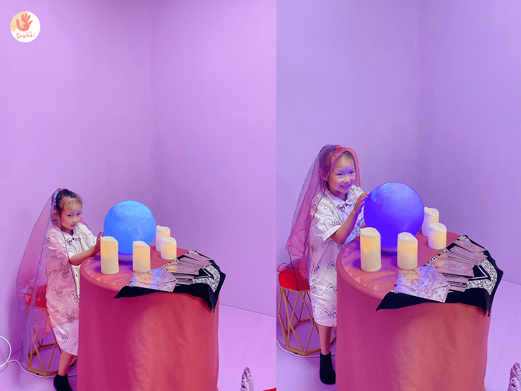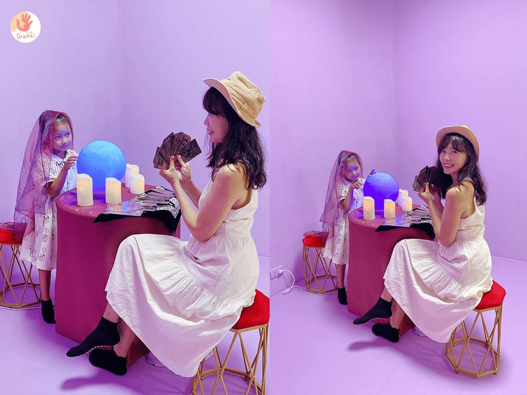 在影片中才會看到的占卜場景竟然在這裡出現了,女鵝戴上了絲巾變身占卡師整個笑開懷