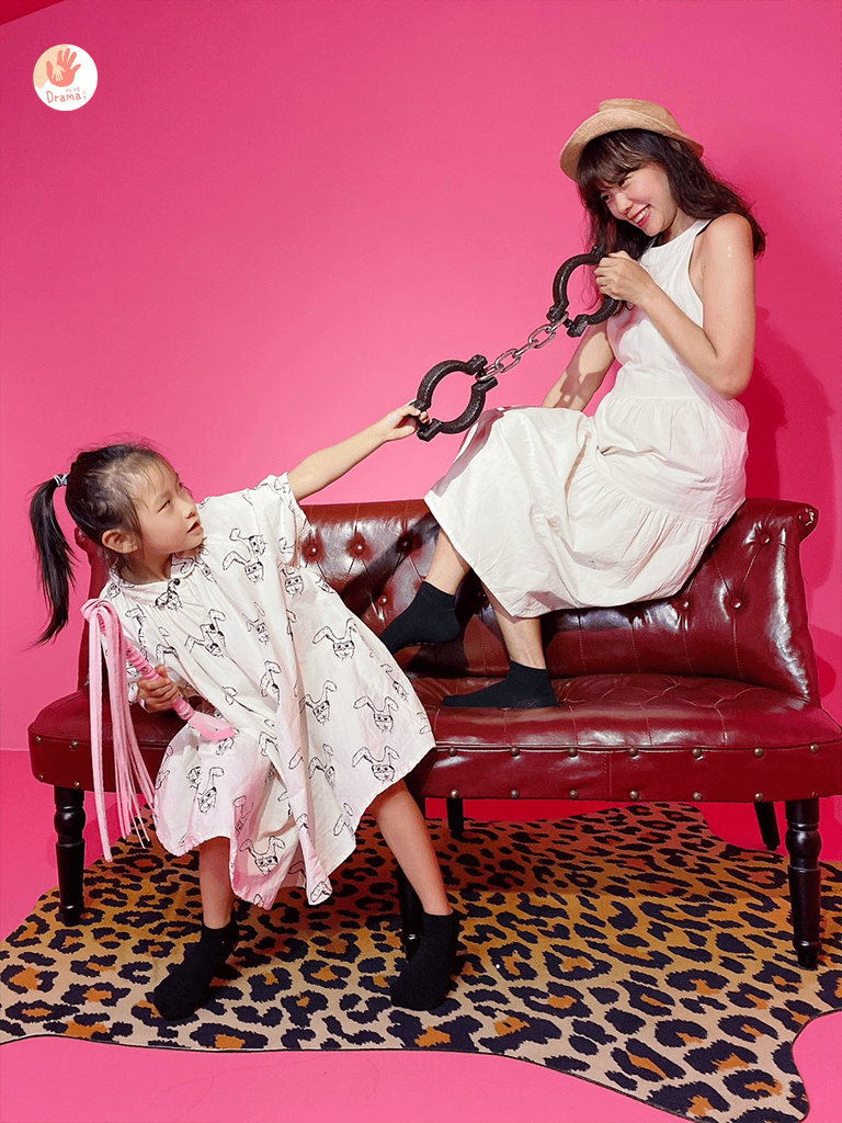 這個場景真的很像是雜誌拍攝場景,有各種SM道具,我們家抓妹看到警察用手銬,也都好奇的想試試
