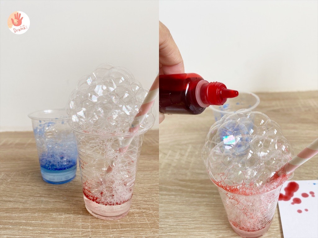 洗碗精加入少許水,如果是使用食用色素可以在泡泡吹起後,滴上去