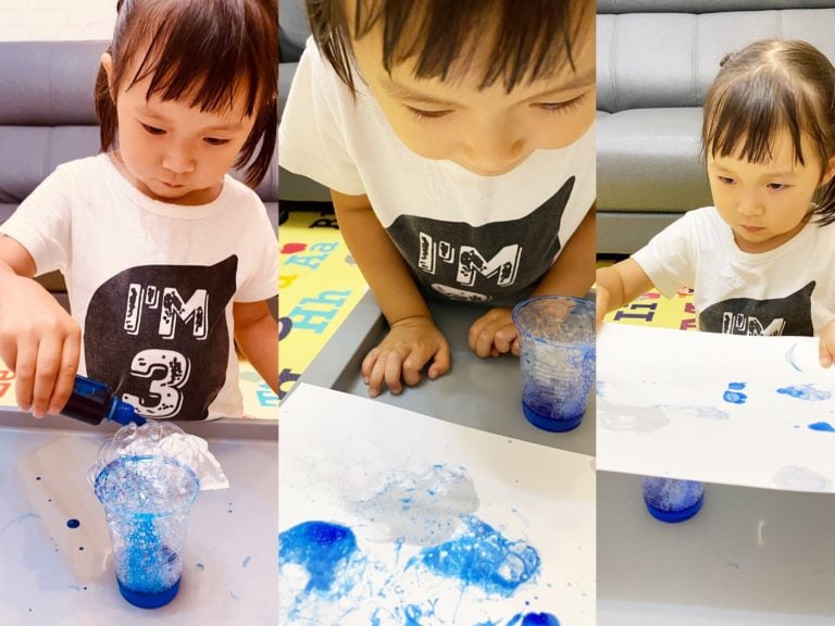一種方式是:泡泡染上顏色後,可以將畫紙蓋在上面,不用太用力,輕輕印上去就可以
