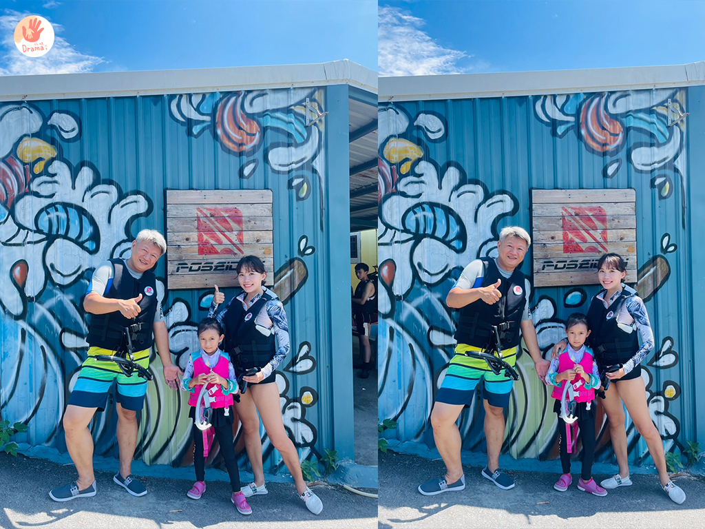 上岸後也會幫大家合照紀錄,時間大約是穿著+教學測試半小時,下水浮潛半小時