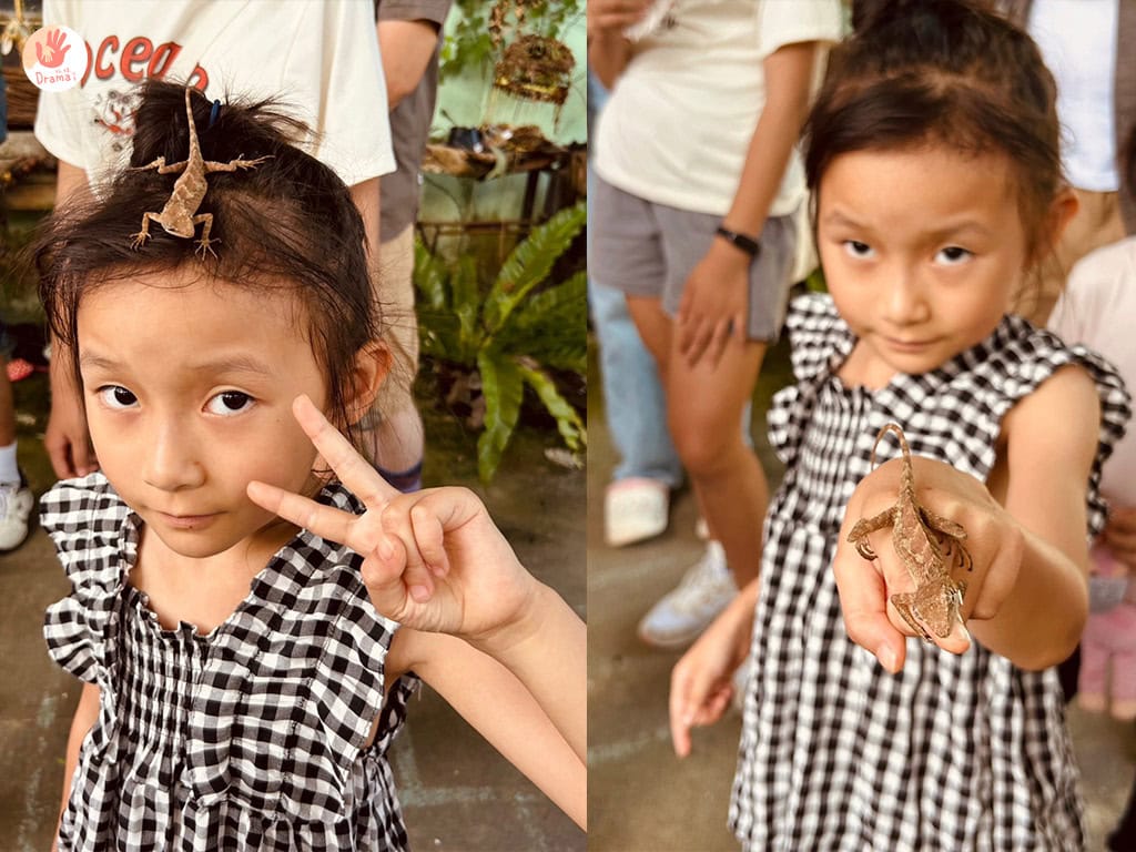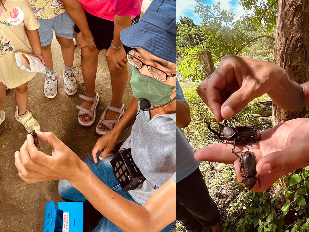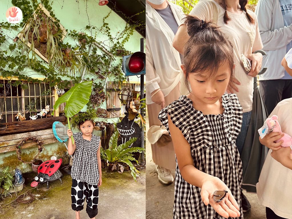還有變身豆豆龍拿著姑婆芋撐傘,還有近距離認識昆蟲,蝴蝶就在手上觀察