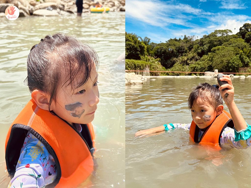 這裡有天然泥,教練會在水裡找到一大塊分享給大家,我們有種變身原住民的FU