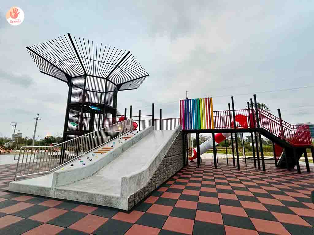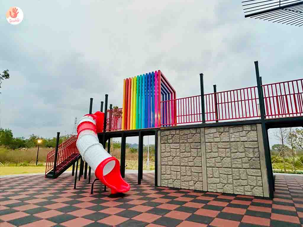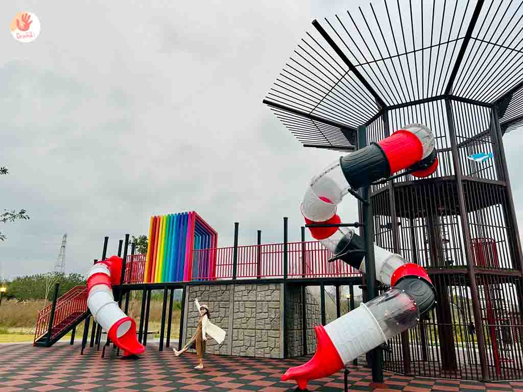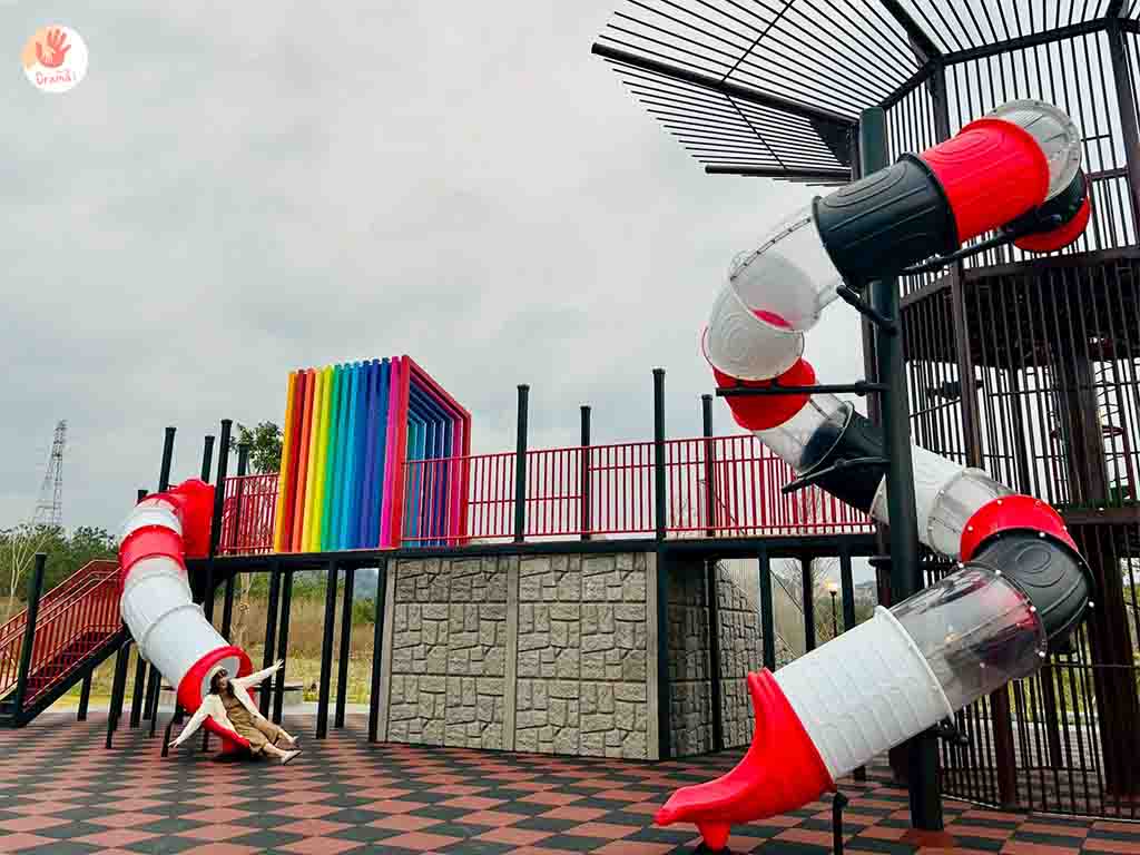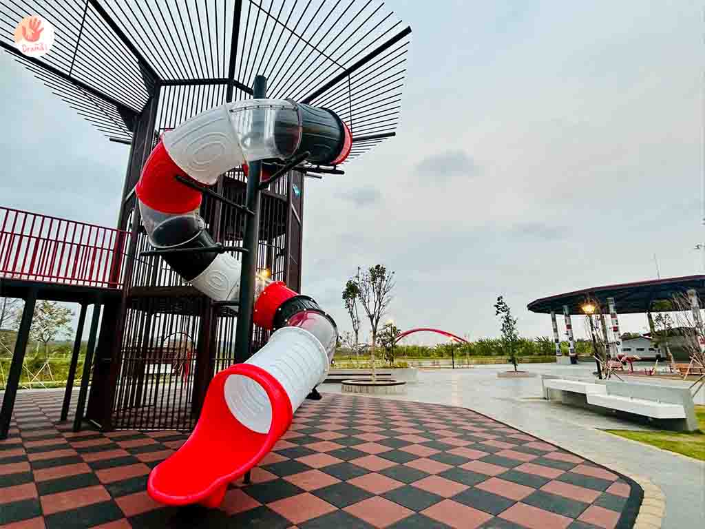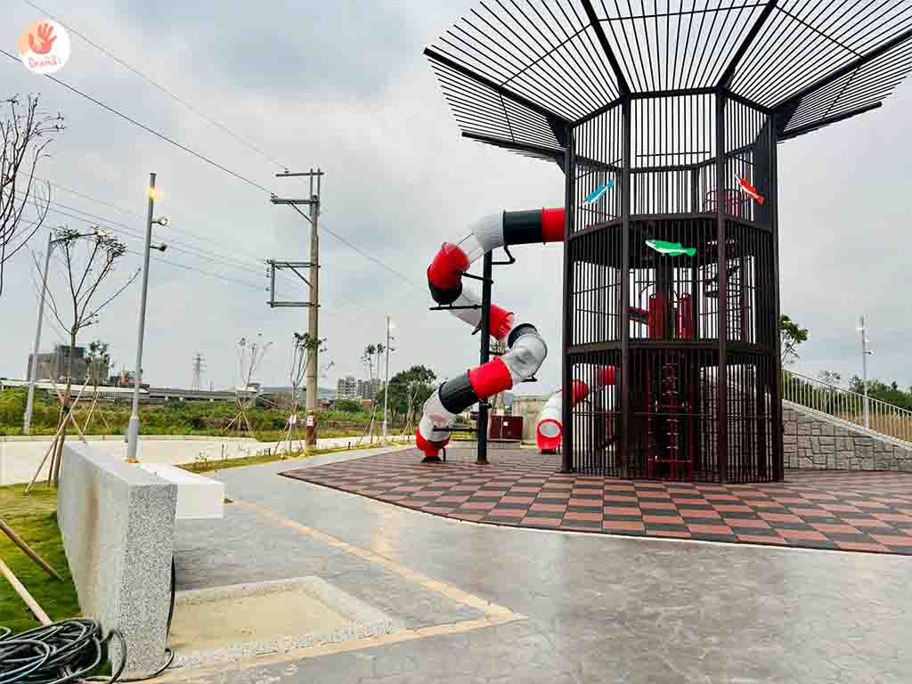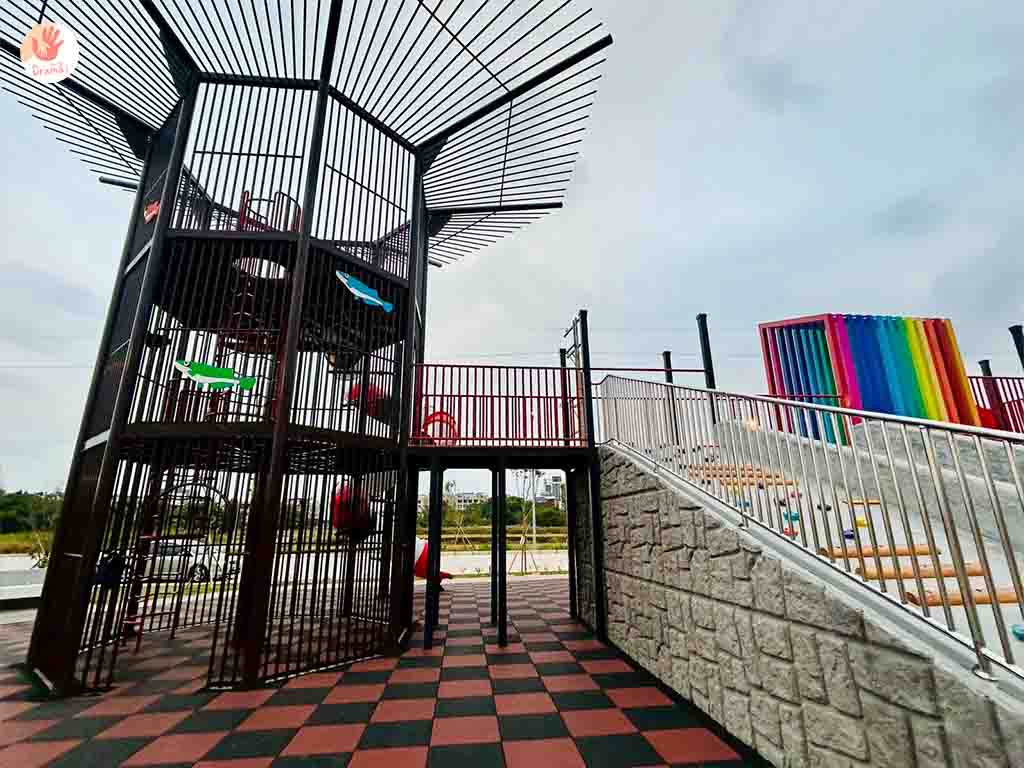 [魚筌造型公園]也有設計適合小幼童玩樂的低樓層溜滑道,結合彩虹隧道繽紛吸睛