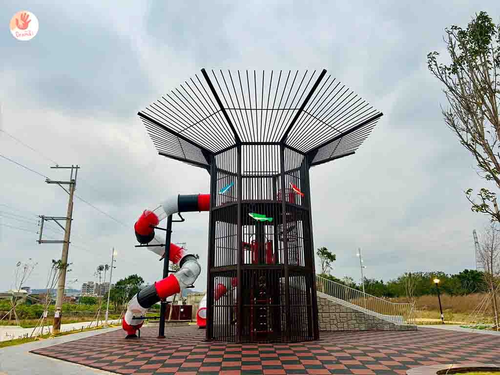 魚筌是一種傳統的捕魚工具,一端大口(筌口),另一端縮小並內收成漏斗狀,[魚筌造型公園]以魚筌意象打造遊戲塔,結合3層樓高的溜滑道,可以讓孩子放電挑戰玩一波