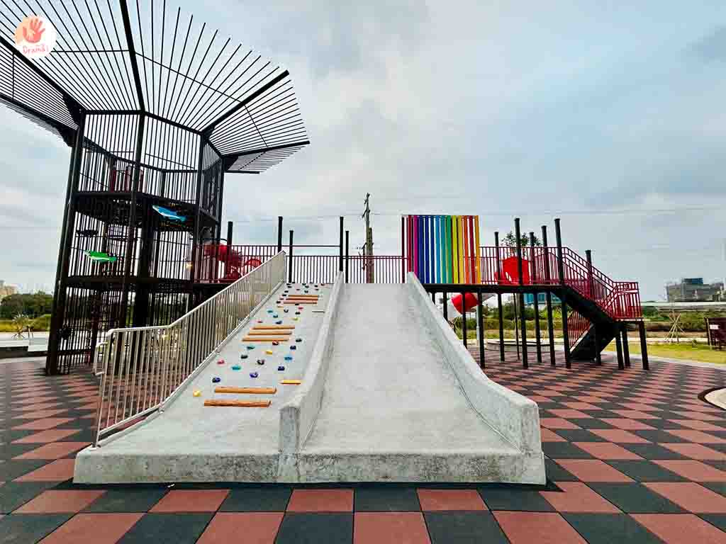 [魚筌造型公園]另一側設計了攀岩和磨石子溜滑梯~大童小童共融一起玩
