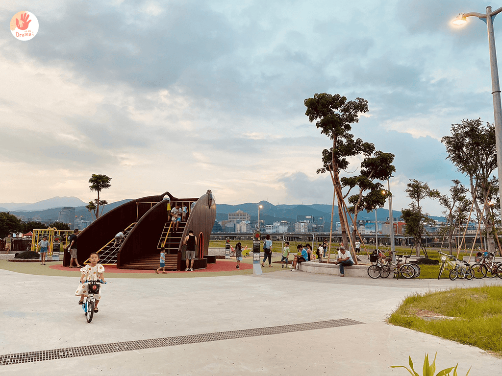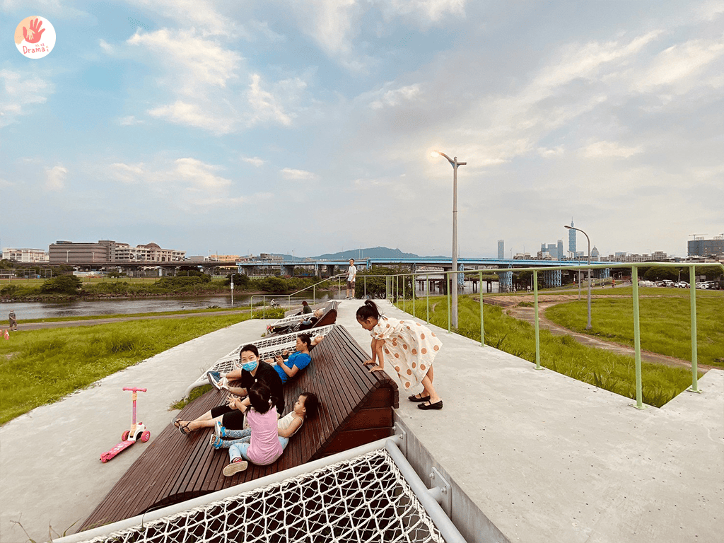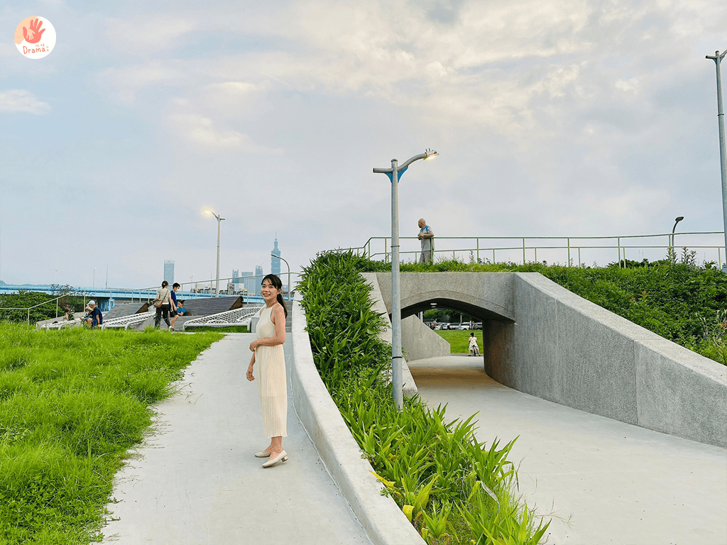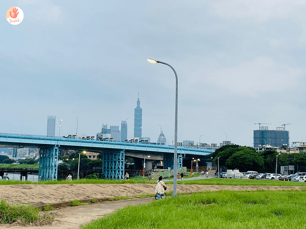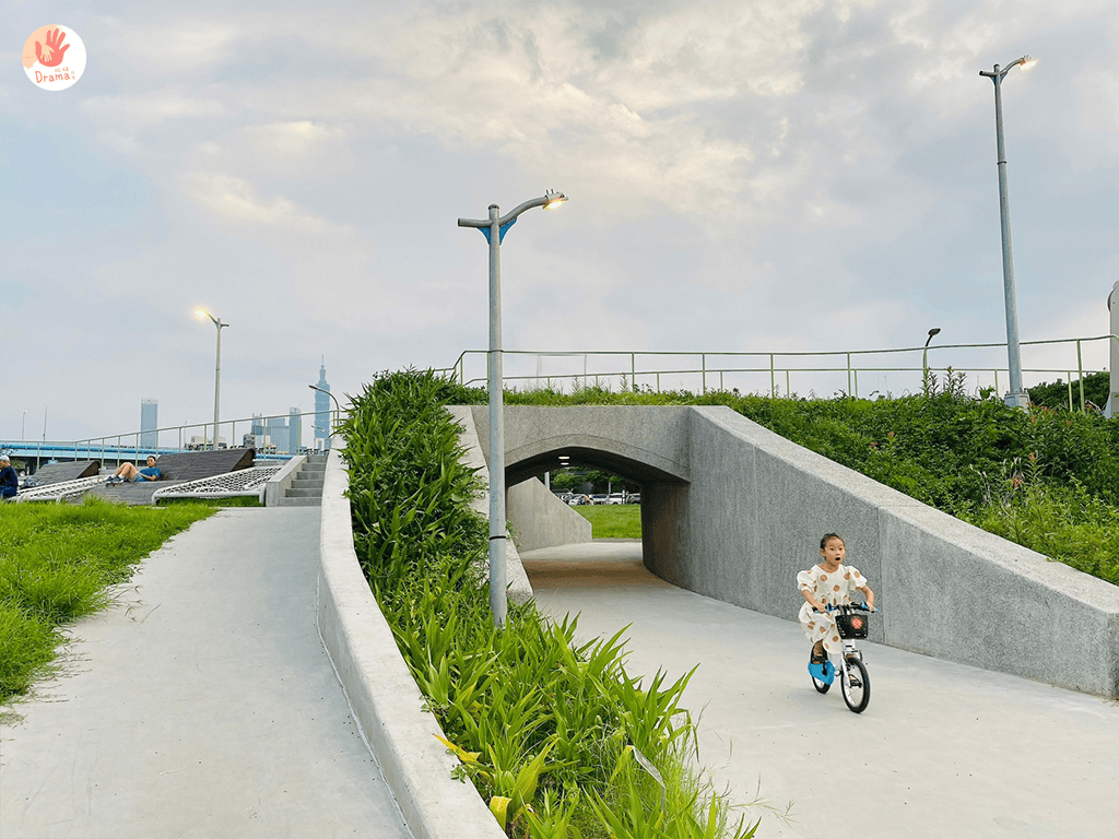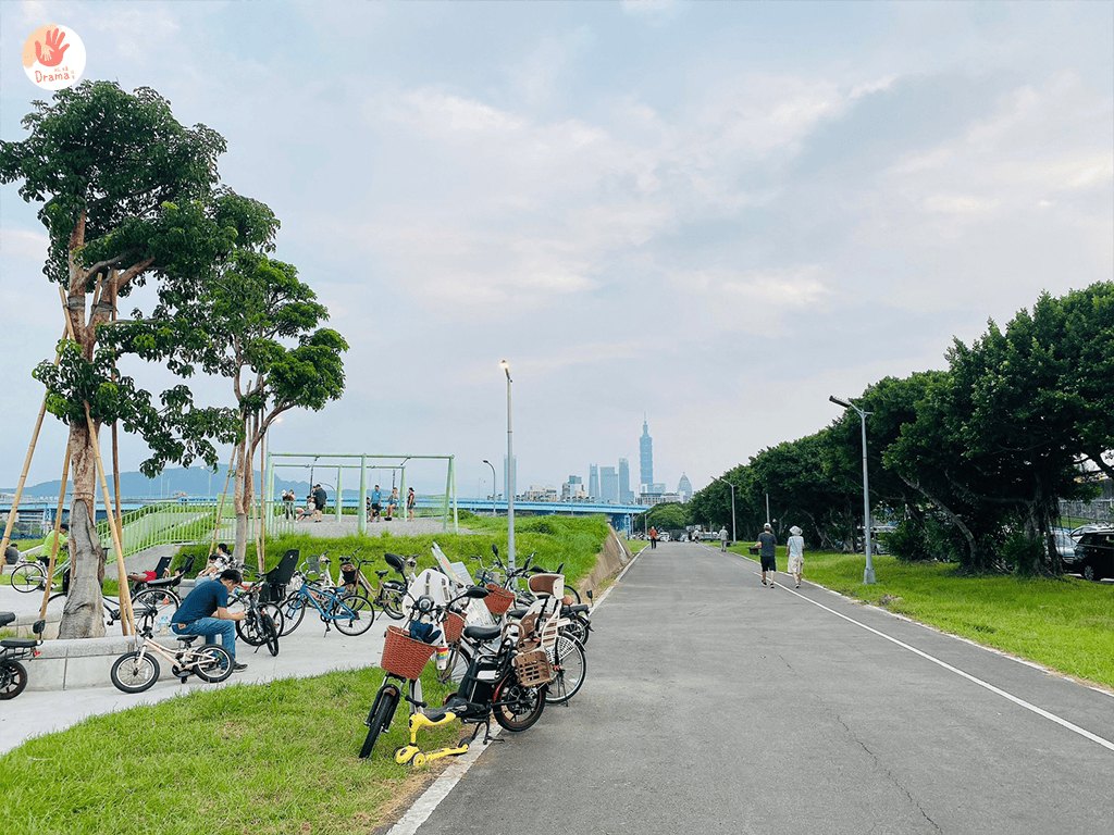 入口有停車場,河堤旁路面很寬也都可以找車位停,隨處視角都可以看到101,這裡有自行車道,也可以帶上腳踏車或滑步車很適合孩子騎車追風