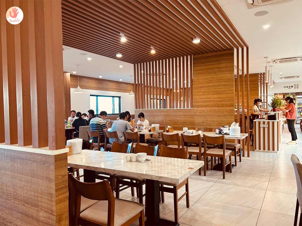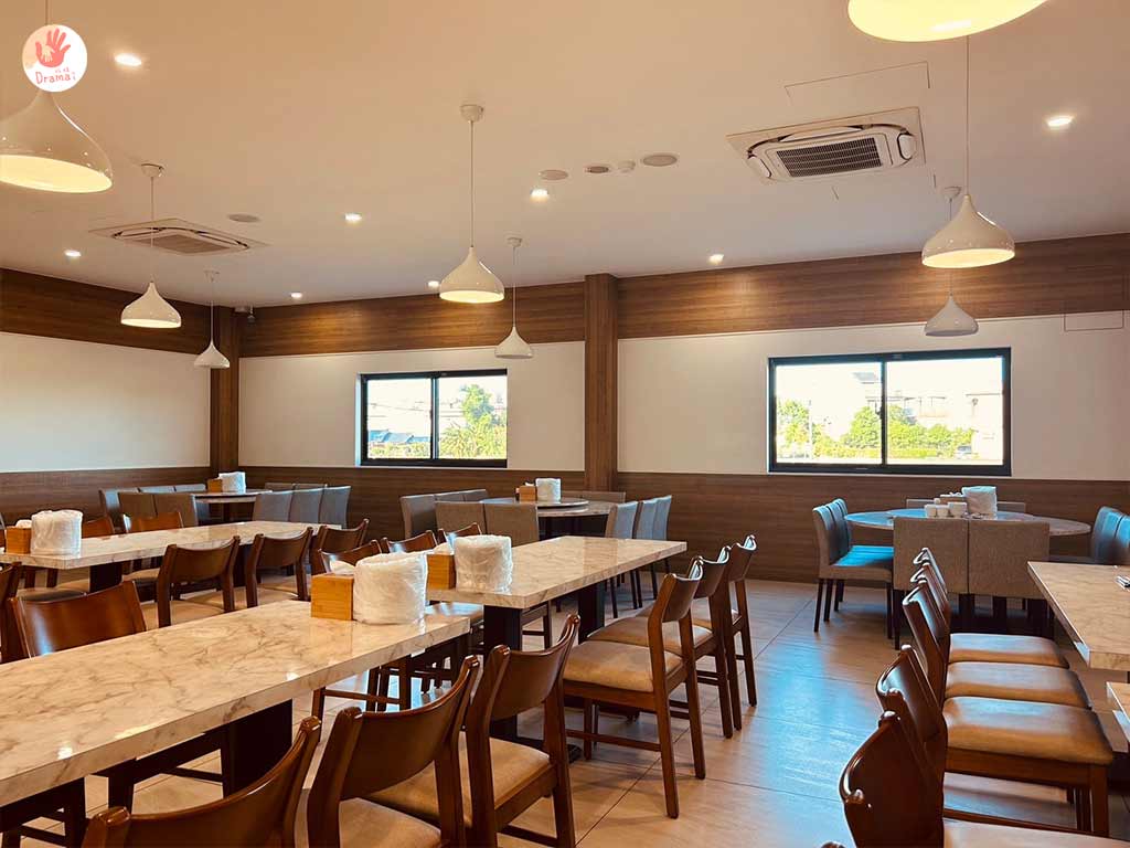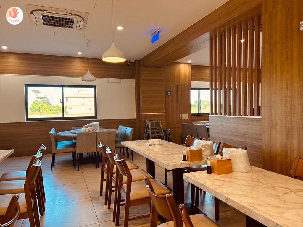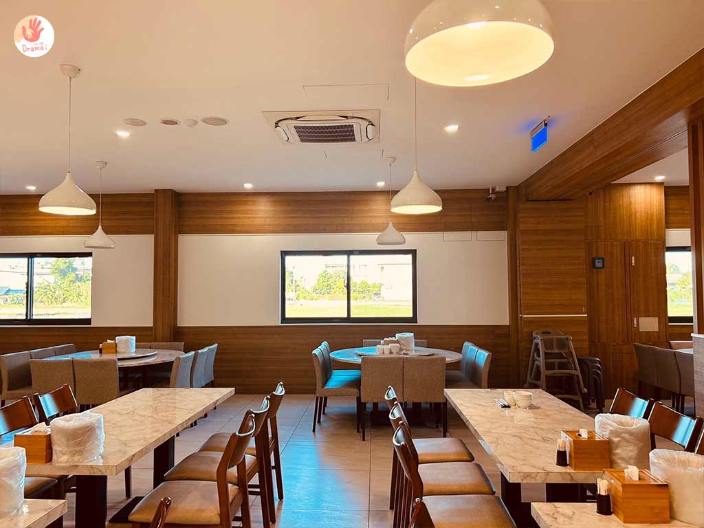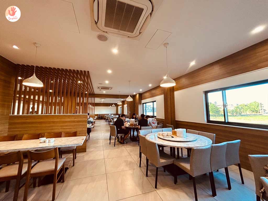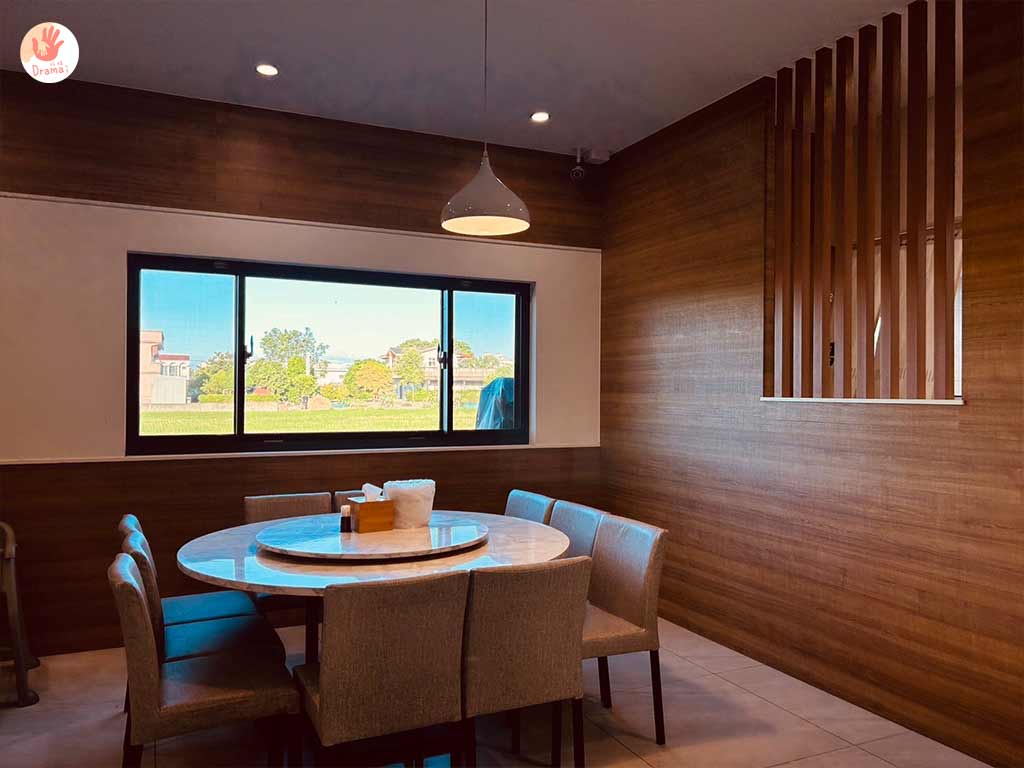 [福哥石窯雞羅東店]店內用木質紋路風格裝潢,很有日式料理的清新簡約風格,窗外還有綠意稻田景觀,用餐環境很舒服放鬆,座位有圖桌和方桌,也很適合小家庭來用餐