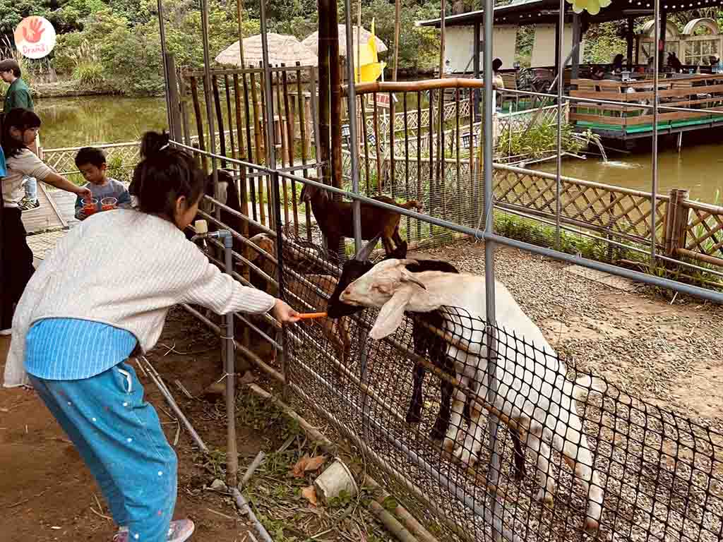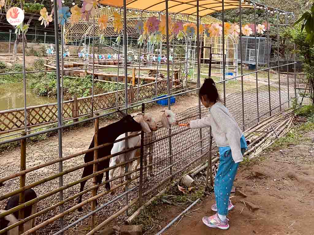 [陶淬湖庭園咖啡]是可以走進山羊飼養區餵,但小孩都怕被山羊當萬人迷包圍,所以都待在欄杆外餵
