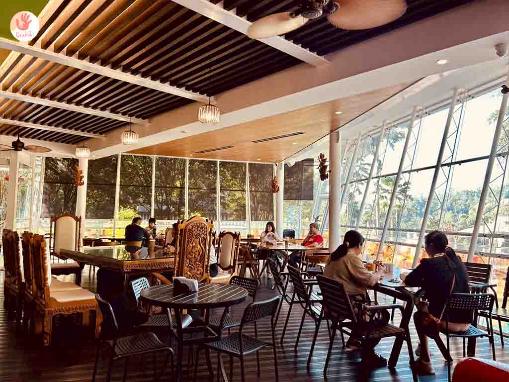 [桂林映象會館]室內桌椅的大桌也有泰式風情,清幽的環境放慢腳步很放鬆