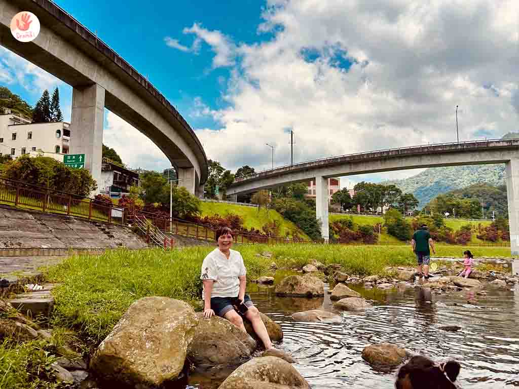 [下坑子口溪親水遊憩區]橋下有遮陽處,很多長輩也來這裡泡腳消暑一下