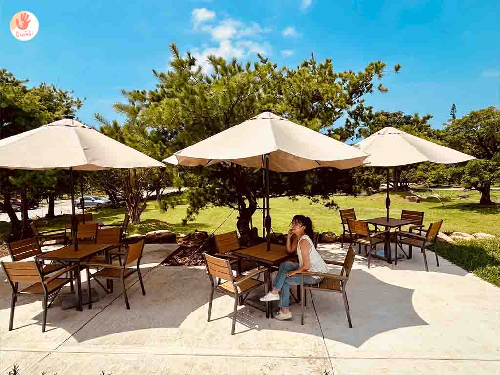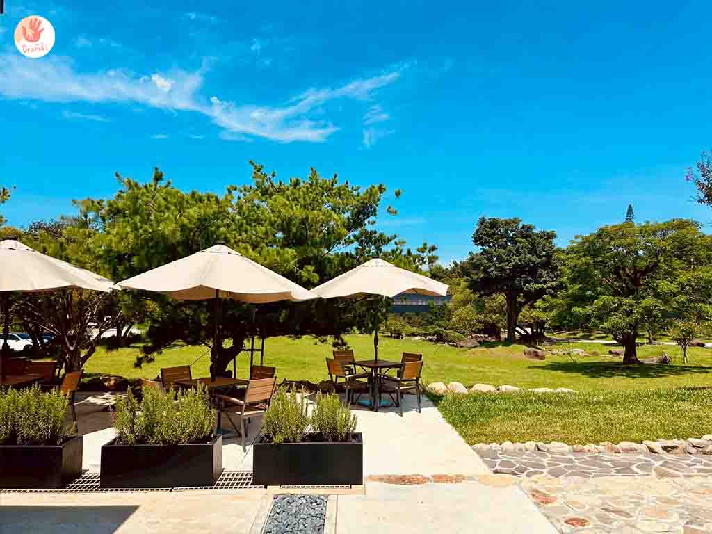 [晴花鹿苑]戶外也有陽傘座位區,想要吹微風曬暖陽也可以選擇坐戶外,也可以帶上草地玩具來遛小孩