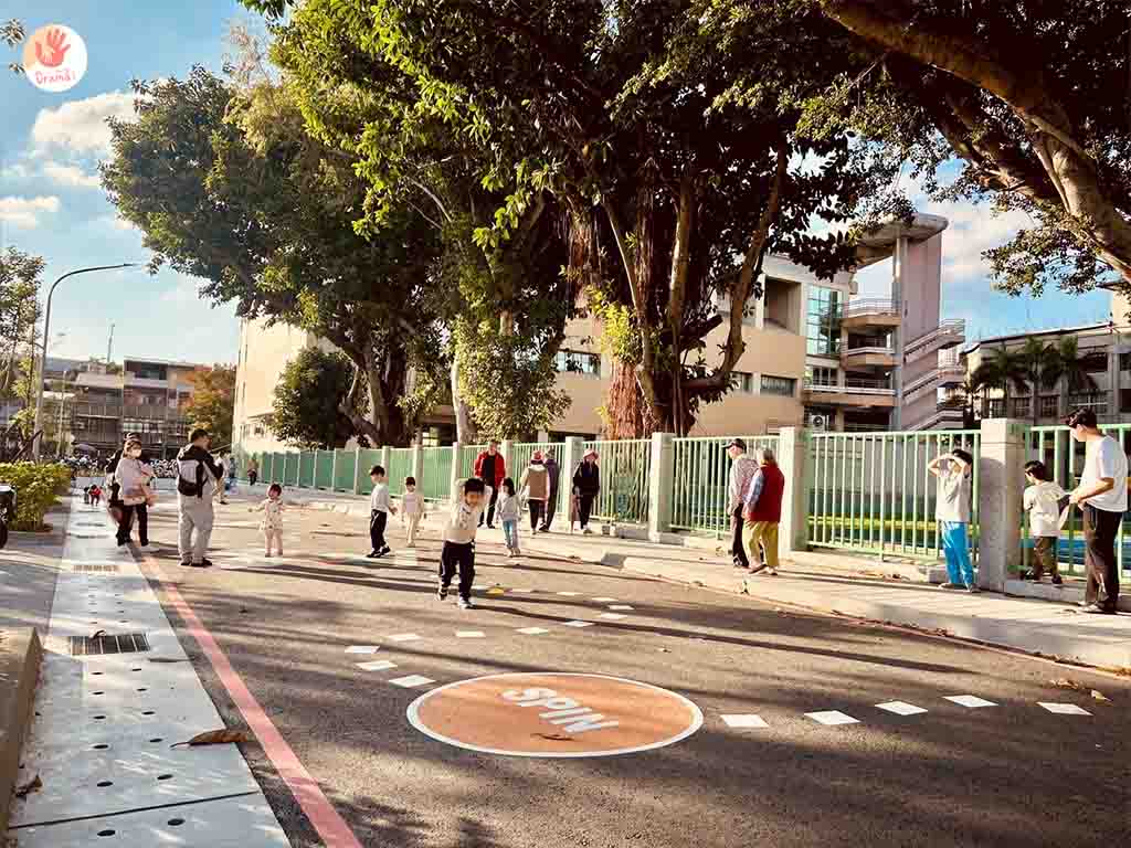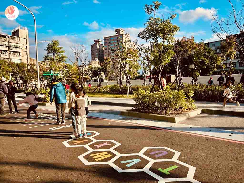 [新莊快樂公園]規劃了一區地面大地遊戲,有跳格子和立定跳遠,也很適合小幼童可以奔跑玩耍