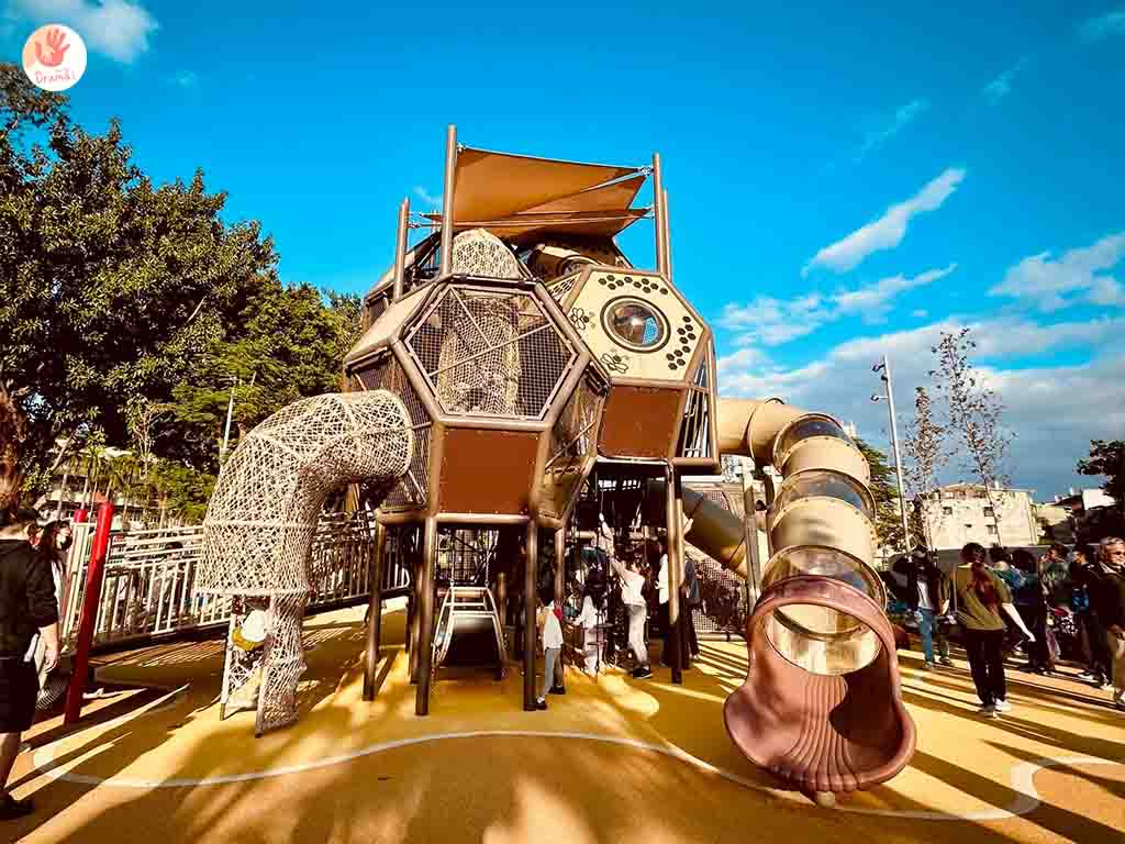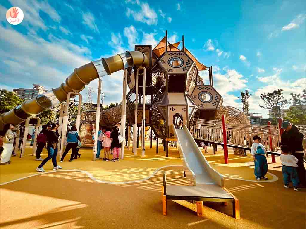 [新莊快樂公園]整合後面積達約6400平方公尺,可愛的蜂巢主題遊戲塔,只可惜缺點是沒有汽車停車場,設有機場停車場,來訪建議可以騎車,鄰近的停車場,車位數也不多。