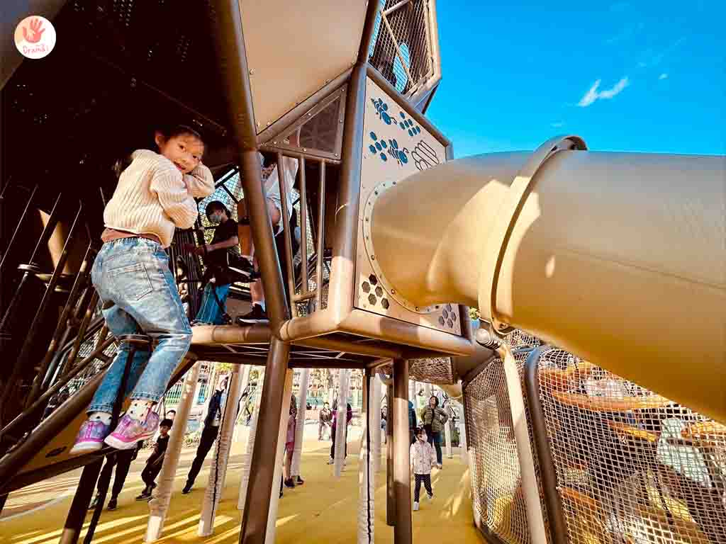 [新莊快樂公園]蜂巢主題遊戲塔時下最流行的咖啡奶茶色主塔色調,帥氣的蜂巢結合三座不同高度的溜滑梯,親子共融大童小童都可以一起玩