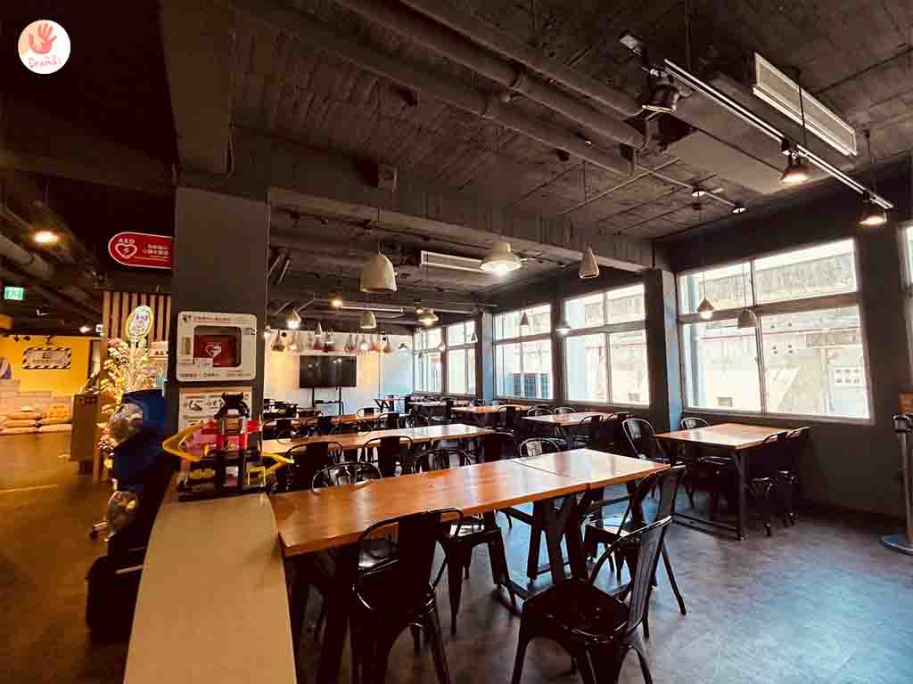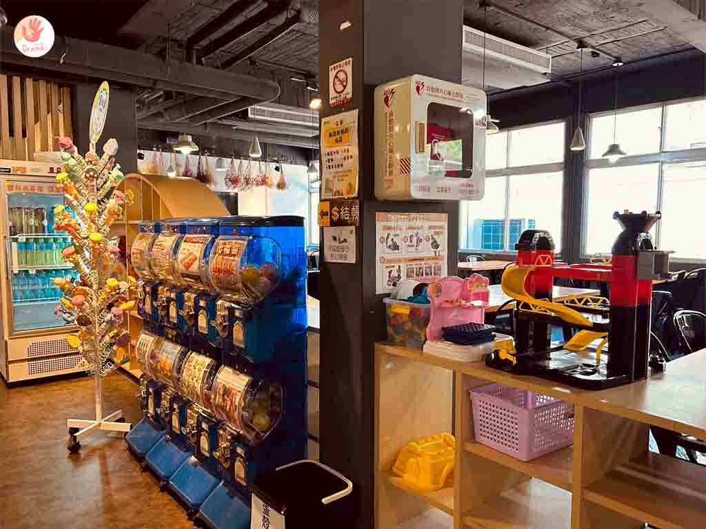 [欣欣水泥森活園觀光工廠]室內也有規劃了餐廳,有提供餐點和飲料,餐桌旁還設有一些玩具讓小孩不無聊