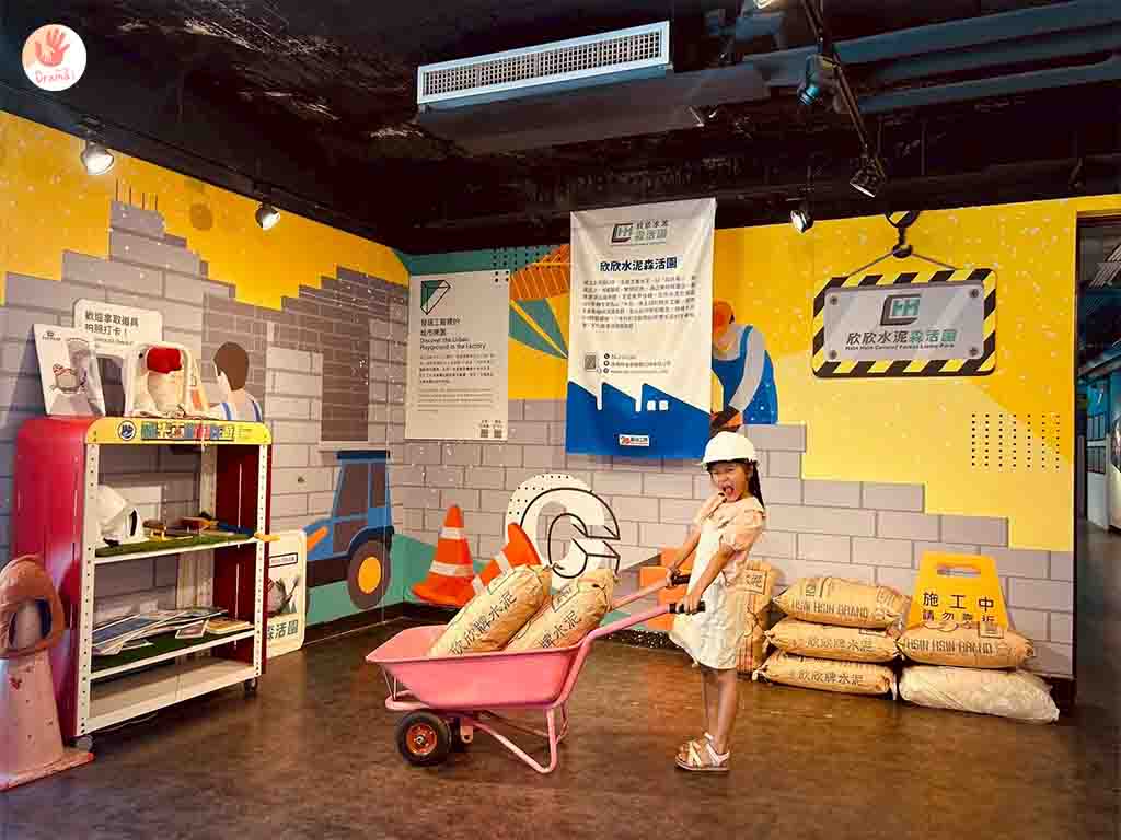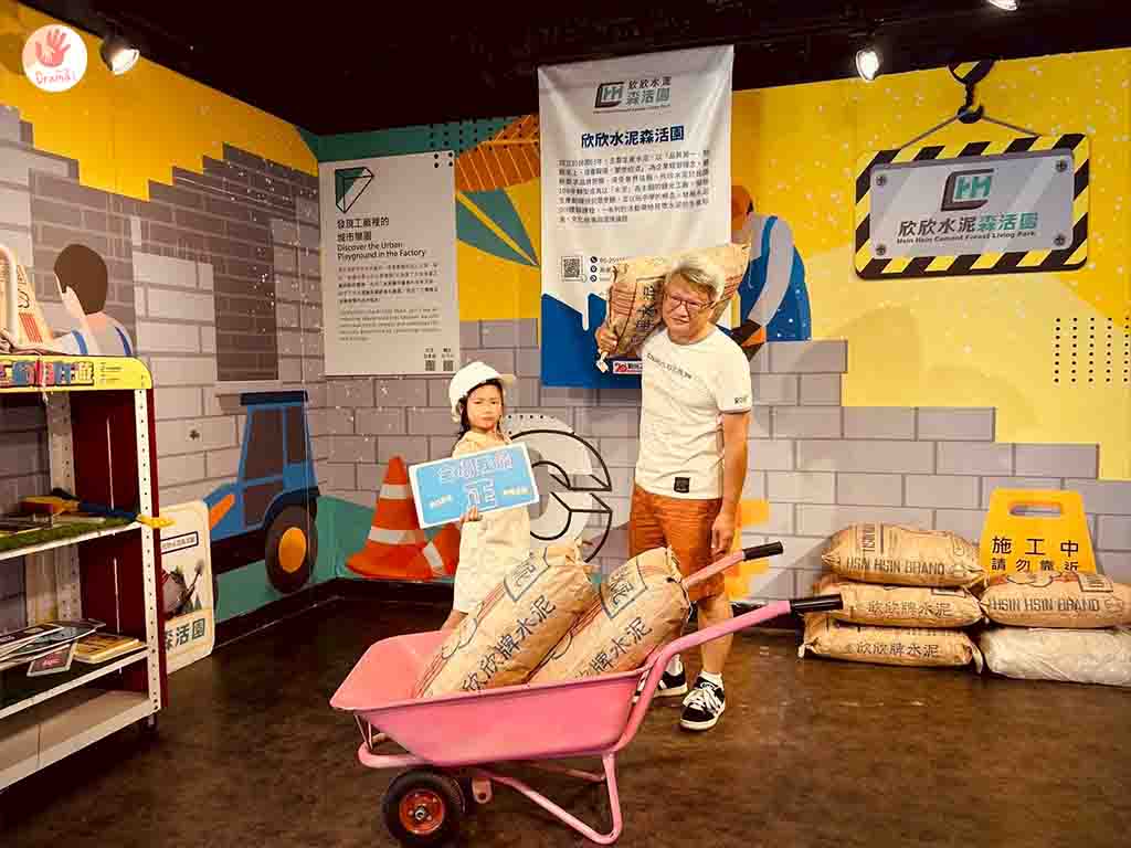 [欣欣水泥森活園觀光工廠]室內空間其實不算大,入口處的水泥工造景真的蠻可愛的,也有很多道具可以使用拍照,大包水泥袋拍起來很有[笑]果