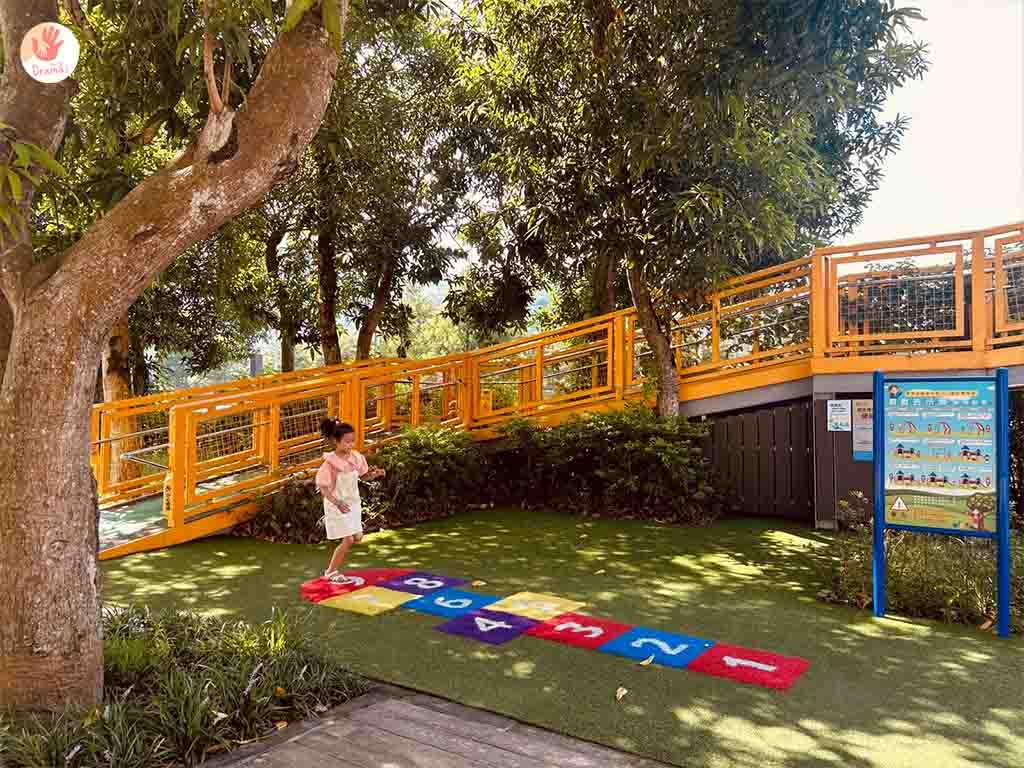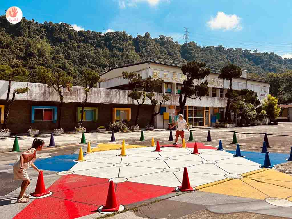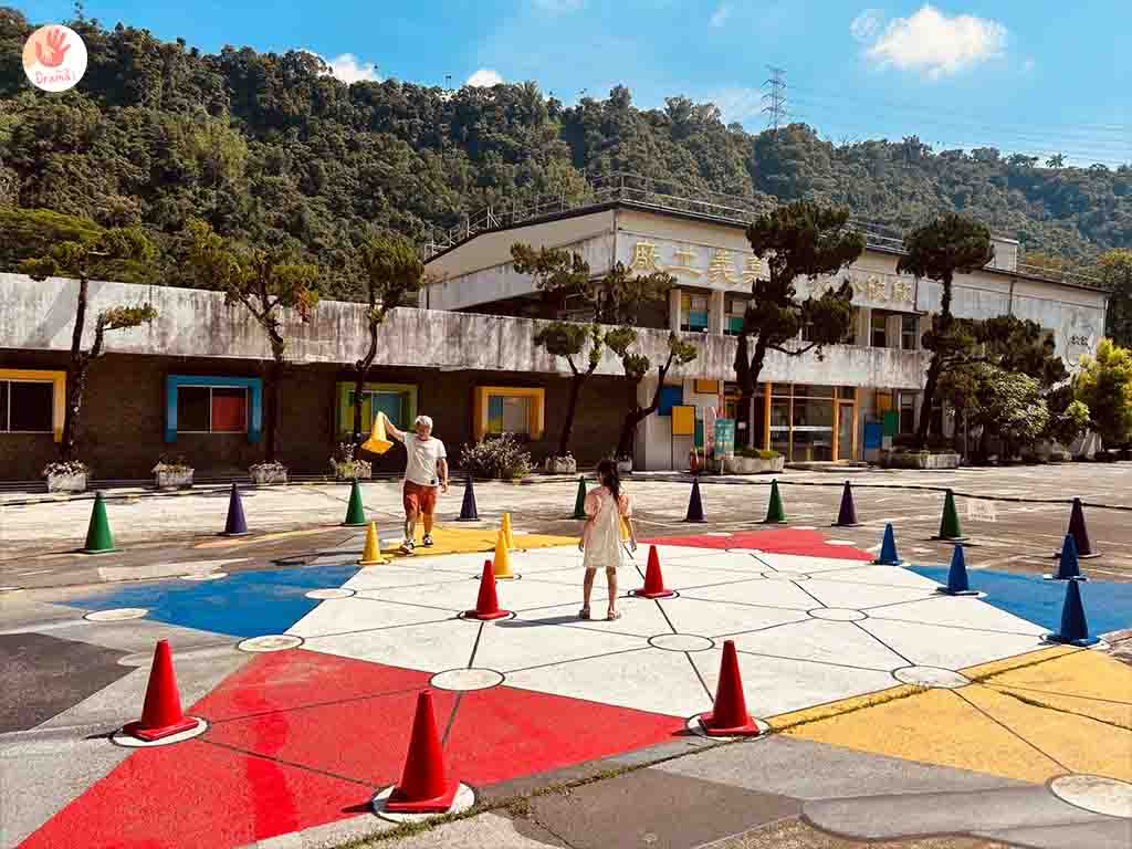 戶外區設有超巨型三角錐的跳棋,抓爸和抓妹忍不住玩了起來