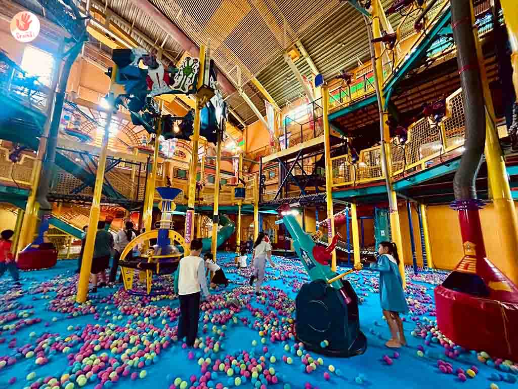 [劍湖山世界主題樂園]室內有一個球池砲彈區,這裡很好玩,小孩可以爬上爬下大玩PK,也有室內溜滑梯,是可以放風孩子,大人休息的設施
