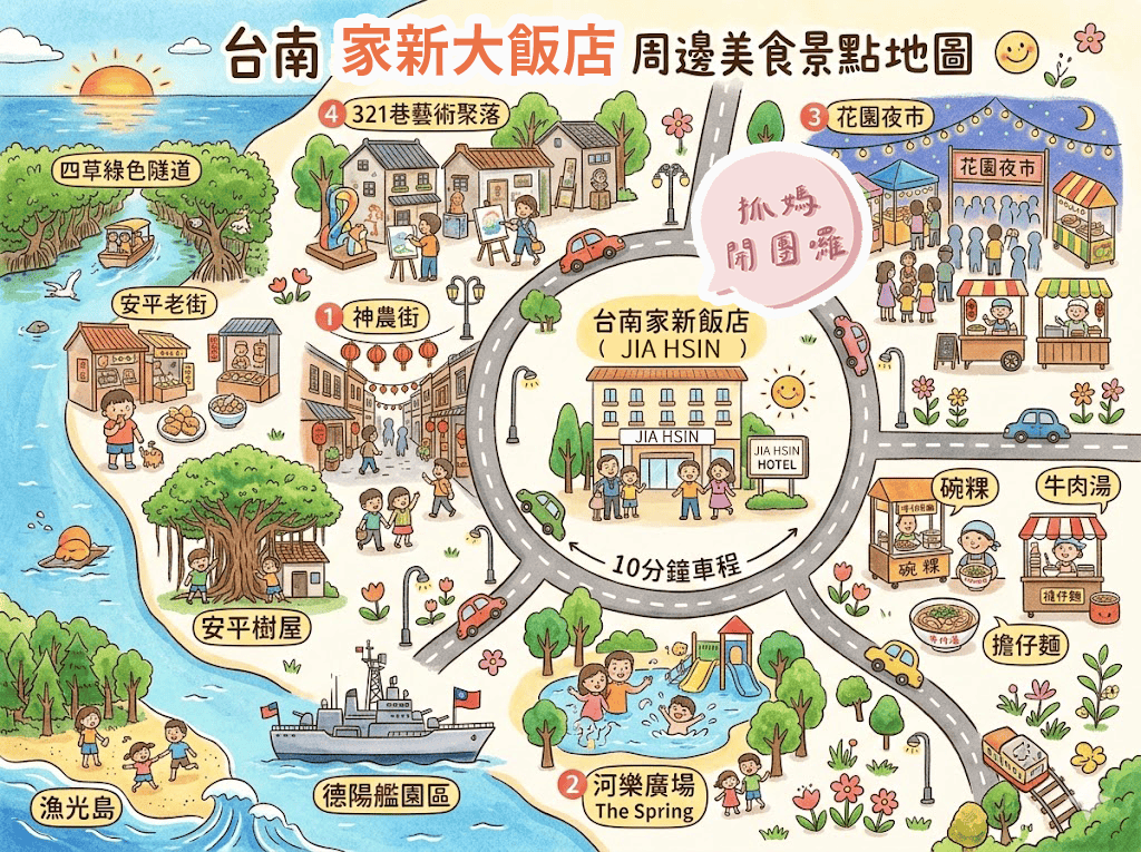 抓媽幫大家整理[台南家新大飯店]鄰近的景點,可以依喜好安排行程!絕佳交通位置~美食景點都玩到