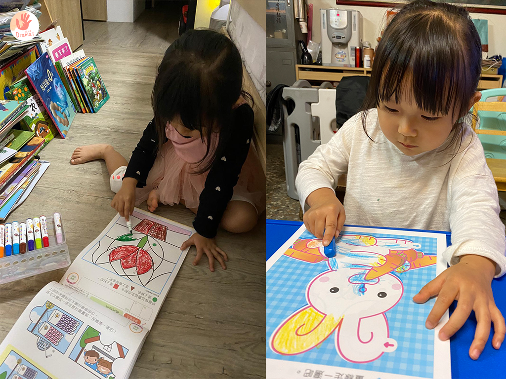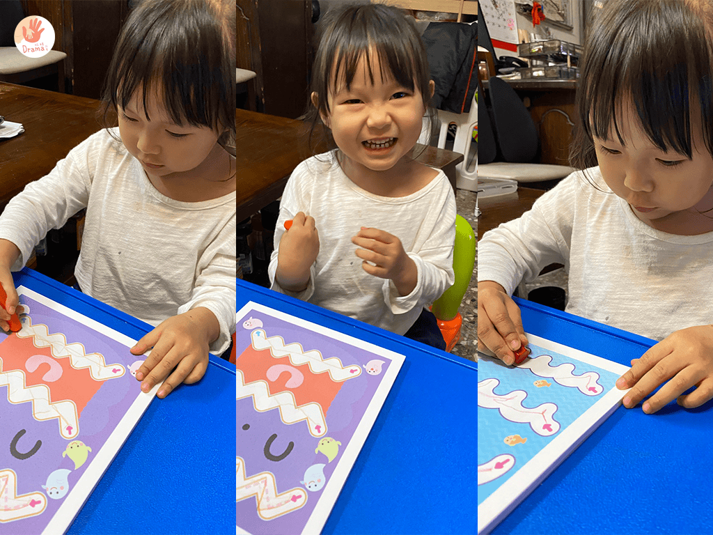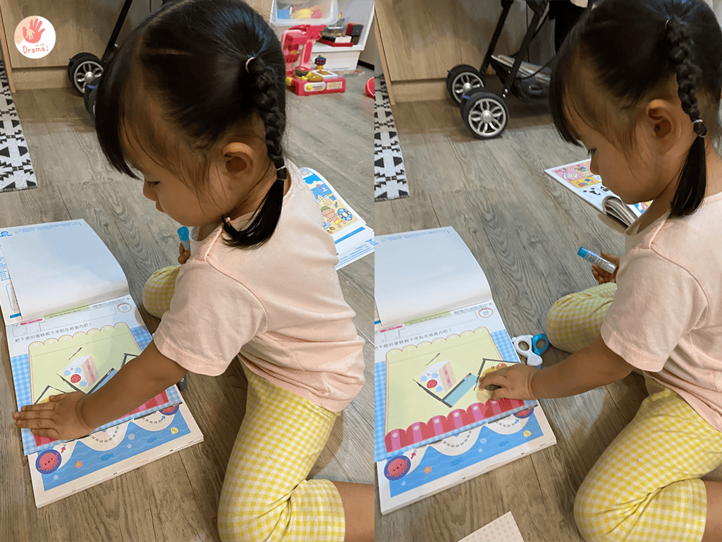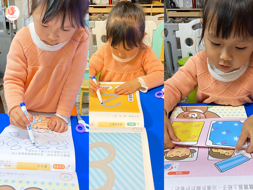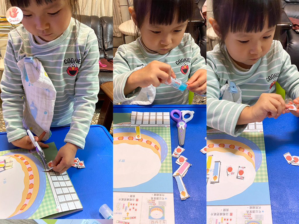 而且有剪貼的任務,可以訓練手指肌肉,寶貝剪刀直線已可以自己獨立完成,自己還會要求要剪在線上,看著孩子成長那感覺真的很棒