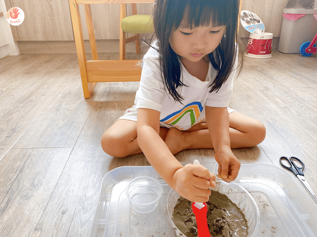 水泥砂3:水1,所以我準備了四個小的塑膠容器,然後再讓寶包加在一起,再攪拌