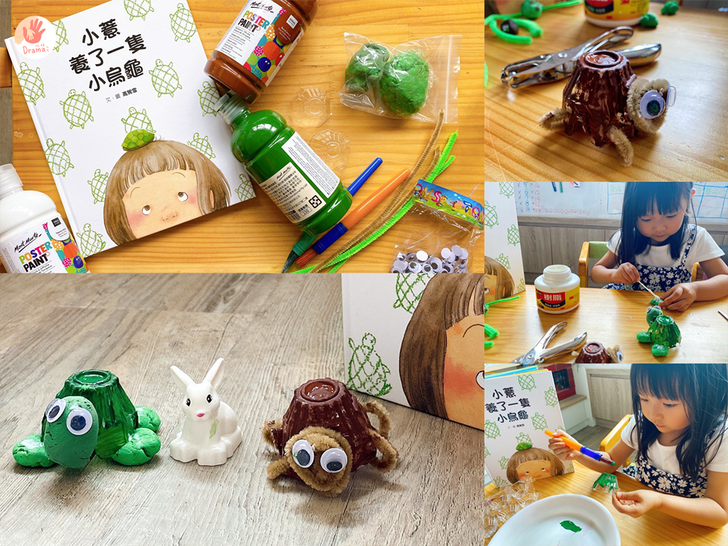 今天用了蛋盒剪下來當烏龜的殼,作法有二種,一種是頭腳都是用黏土,或是頭腳都是毛根,咖啡色的烏龜我是用打洞器打洞後穿過纏繞
