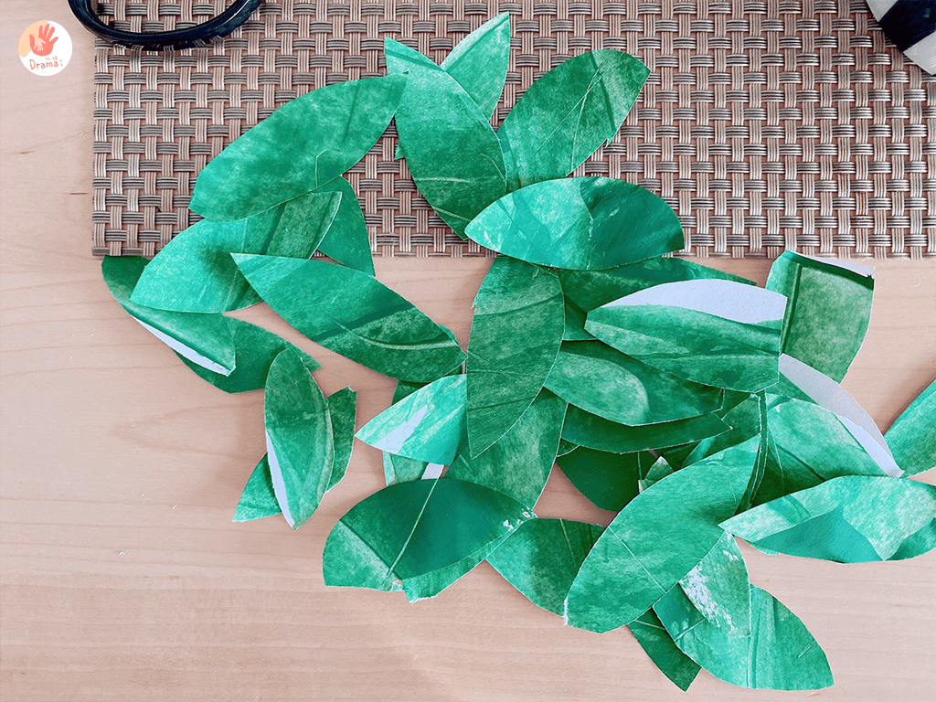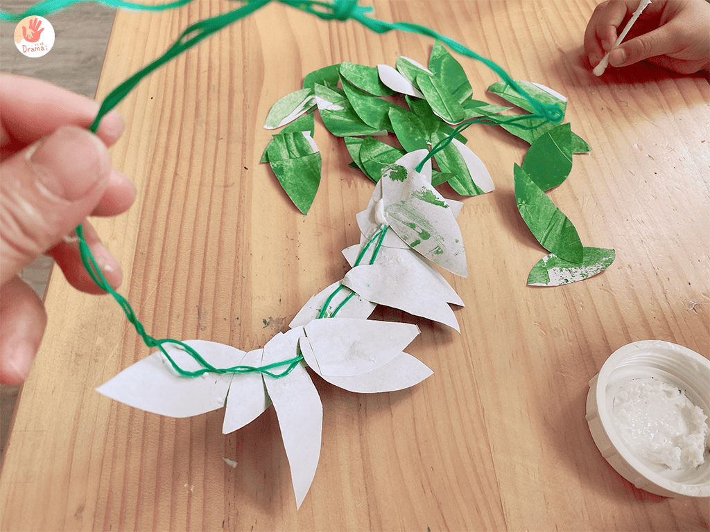 用魔帶量好寶貝的頭圍,讓寶貝用白膠貼上葉子,葉子要包夾魔帶,這樣可以增加附著度