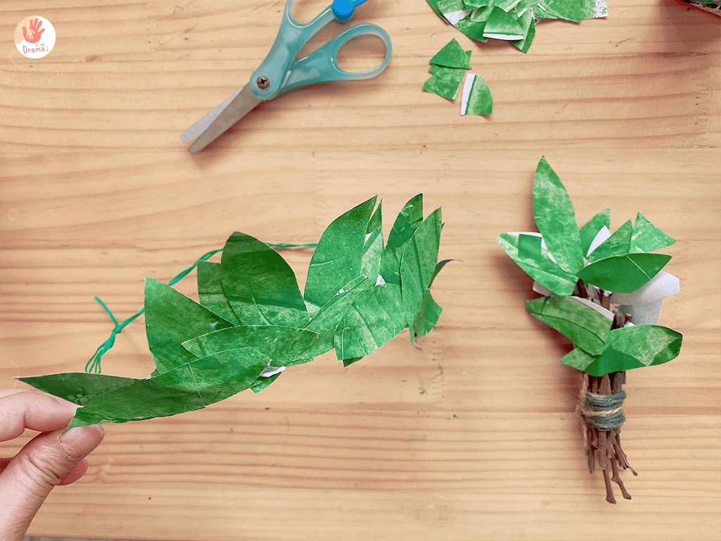 剪數支樹枝用麻線綁起來,再讓寶貝貼上葉子,原本馬麻只想貼半面,但後來就想說讓女鵝自由貼,女鵝貼了雙面葉片,讓手時的月桂捧花更自然
