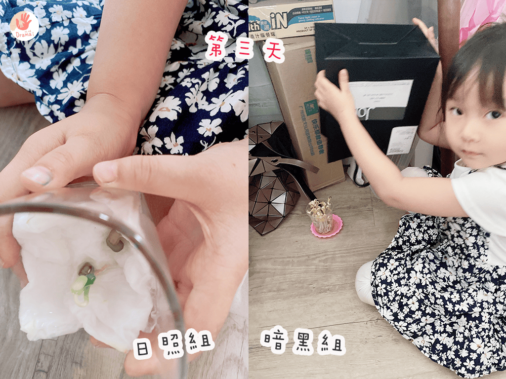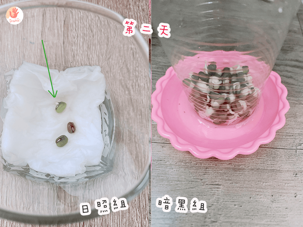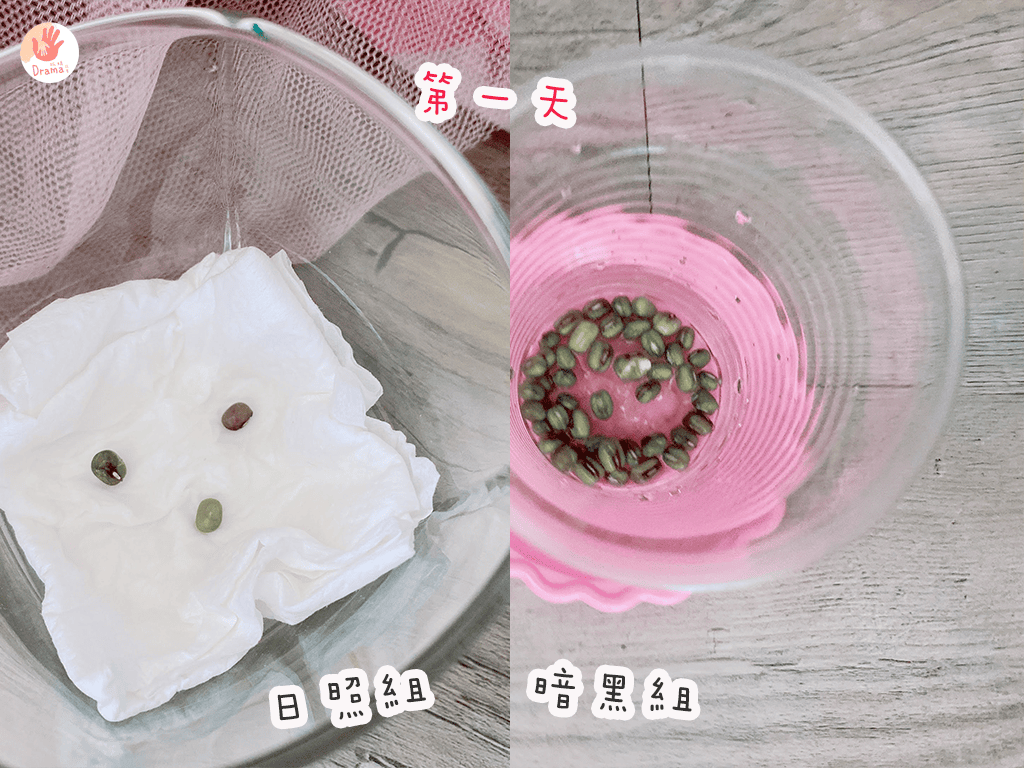 來看看種綠豆,一個是日照組,一個是暗黑組(題外話:記得洗綠豆時,綠豆要小心不要掉到水槽裡,因為很可能就會長出豆芽菜)。暗黑組就是蓋上全黑的袋子