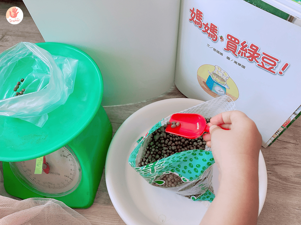 媽媽買綠豆這本繪本是社團媽媽很多人都推薦的好書,入手後真的覺得很棒,故事描述媽媽帶著孩子去甘仔店買綠豆,回家後,小孩興奮的想吃,媽媽說要先泡一下(這個真的是要煮過的人才會知道的小知識耶),等到綠豆放大再煮,綠豆要煮好久,煮好還要泡涼,小時候我們會裝到綠豆的PP袋當冰吃,女鵝則是要像繪本中一樣分裝到副食品盒裡。
