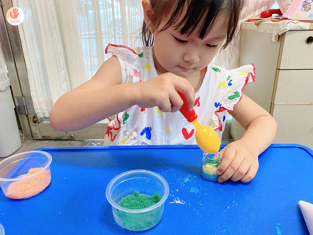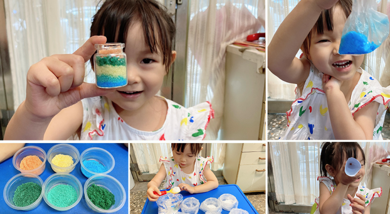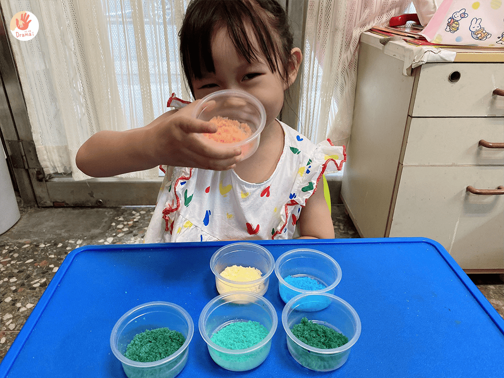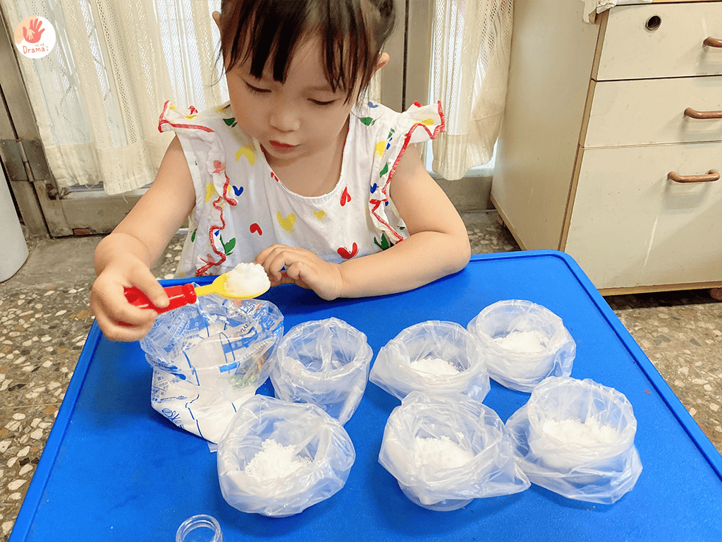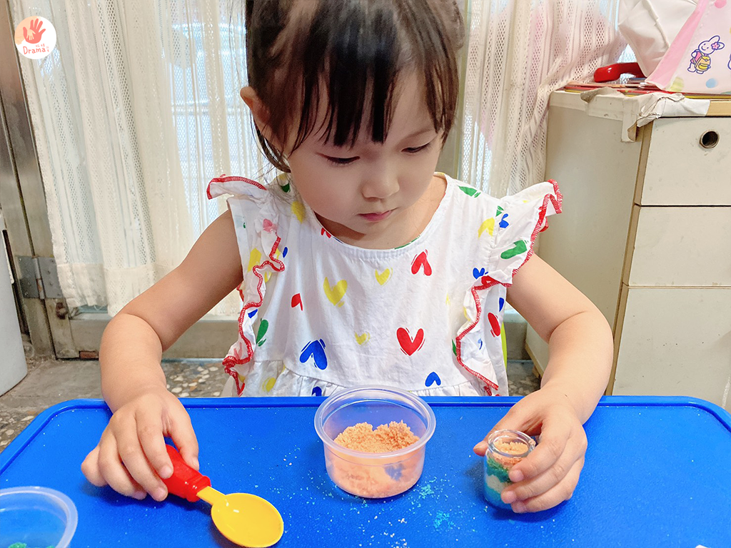 下雨天或疫情時期不想出門,寶貝在家玩具玩到乏了,就和寶貝一起玩手作,染色鹽巴是很簡單又可以和寶貝玩互動的入門級手作,準備六個小容器和塑膠帶,拿出寶貝的玩具湯匙,每一個容器加入二湯匙,寶貝一個一個步驟慢慢完成,看到白色鹽巴變色心情就超好。