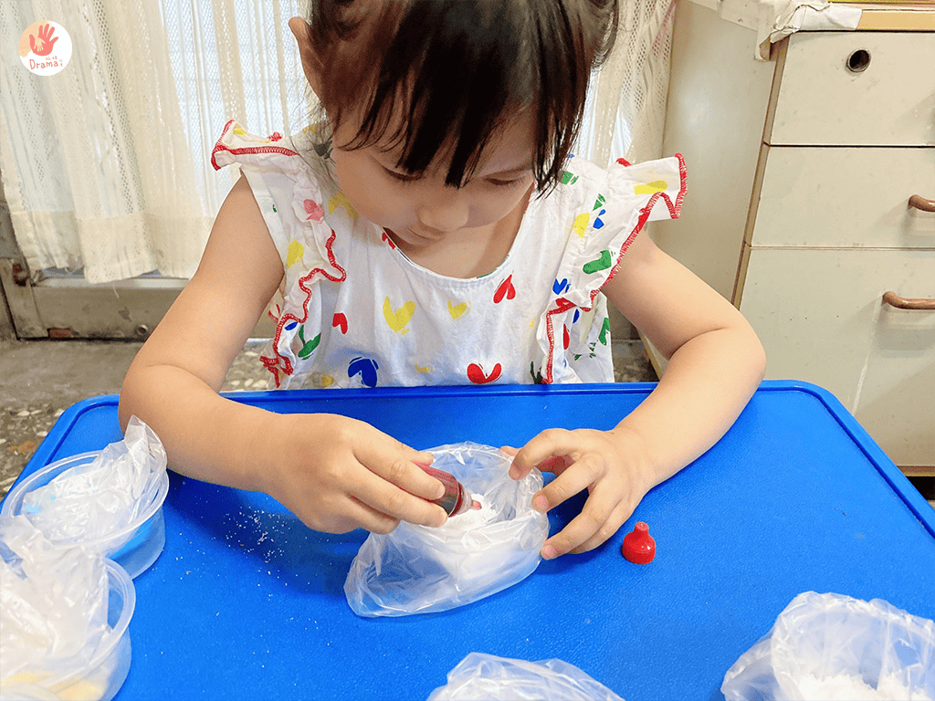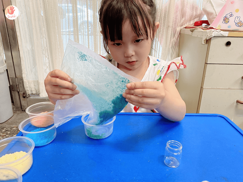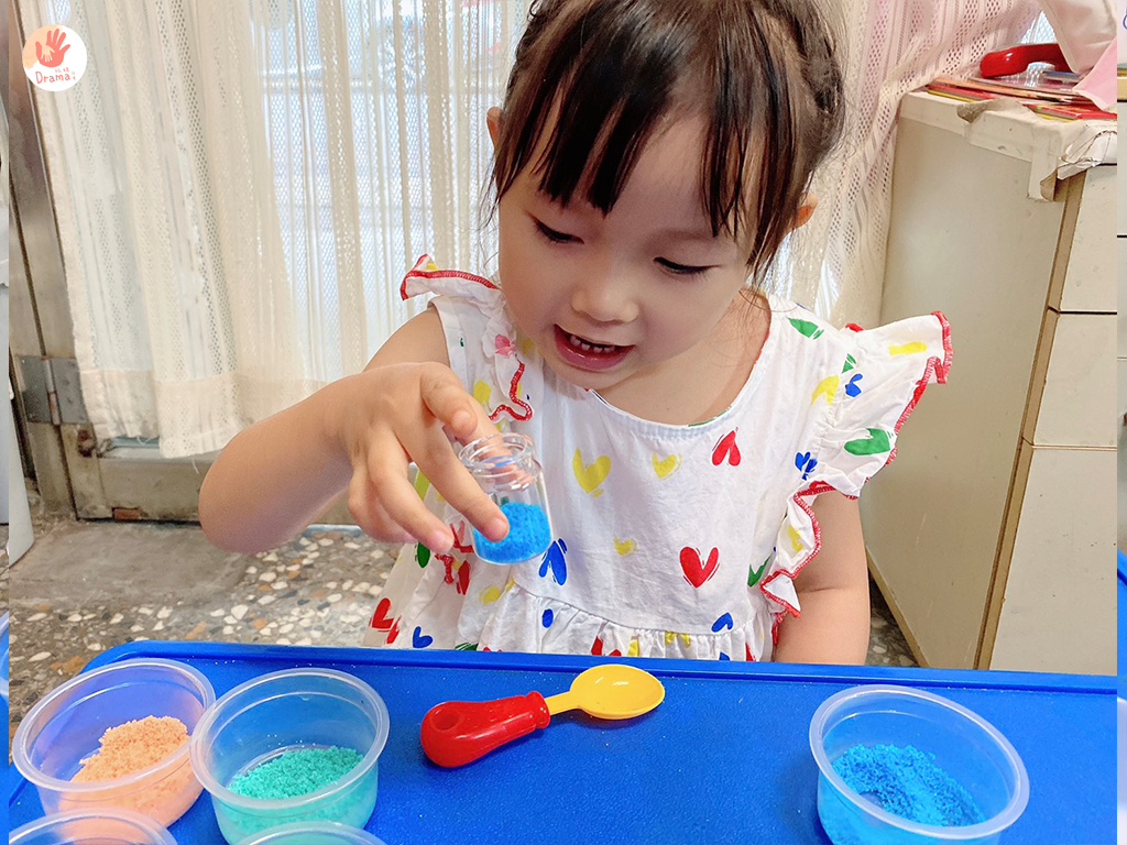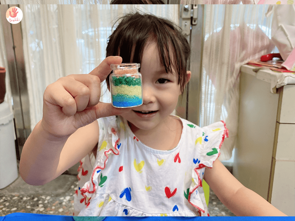 下雨天或疫情時期不想出門,寶貝在家玩具玩到乏了,就和寶貝一起玩手作,染色鹽巴是很簡單又可以和寶貝玩互動的入門級手作,準備六個小容器和塑膠帶,拿出寶貝的玩具湯匙,每一個容器加入二湯匙,寶貝一個一個步驟慢慢完成,看到白色鹽巴變色心情就超好。