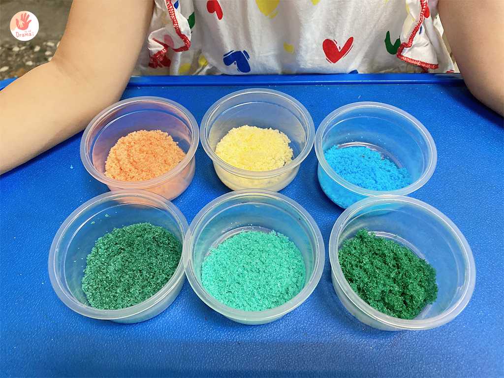 染色後的彩鹽光看就很療癒,二個深綠色都是混色失敗後的結果,所以記得混色一定要在另外的容器先調好
